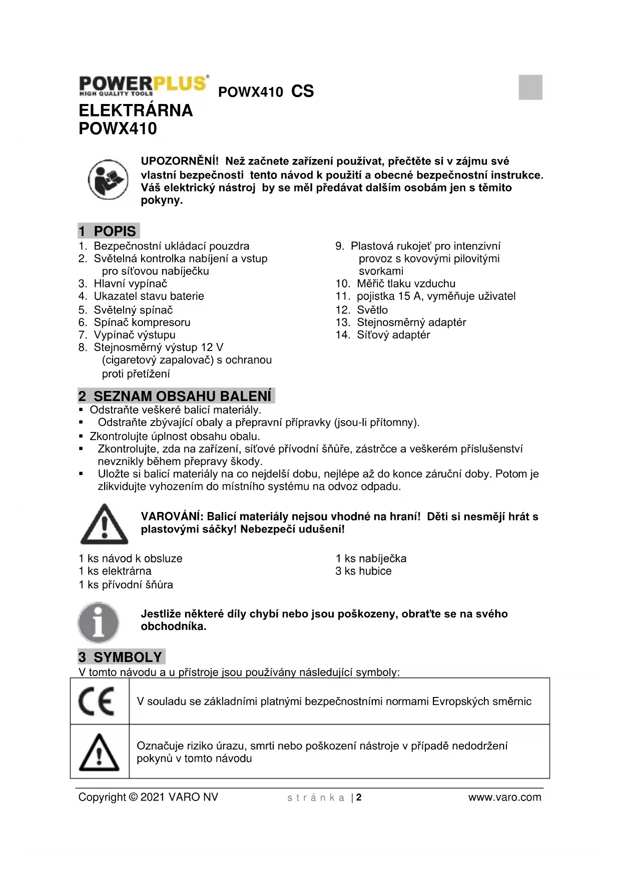 Copyright © 2021 VARO NV s t r á n k a | 2 www.varo.com ELEKTRÁRNA POWX410 UPOZORNĚNÍ! Než začnete zařízení používat, přečtěte si v zájmu své vlastní bezpečnosti tento návod k použití a obecné bezpečnostní instrukce. Váš elektrický nástroj by se měl předávat dalším osobám jen s těmito pokyny. 1 POPIS