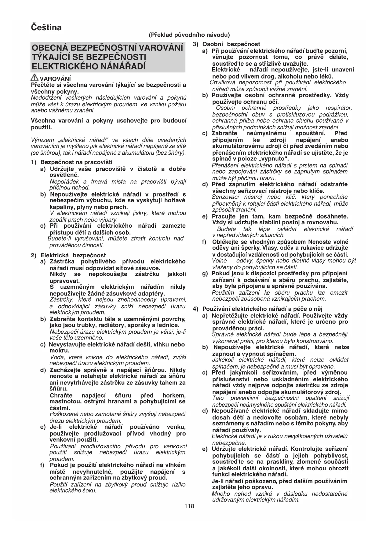VAROVÁNÍ Přečtěte si všechna varování týkající se bezpečnosti a všechny pokyny. Nedodržení veškerých následujících varování a pokynů může vést k úrazu elektrickým proudem, ke vzniku požáru anebo vážnému zranění. Všechna varování a pokyny uschovejte pro budoucí použití. Výrazem „elektrické nářadí“ ve všech dále uvedených varováních je myšleno jak elektrické nářadí napájené ze sítě (se šňůrou), tak i nářadí napájené z akumulátoru (bez šňůry).