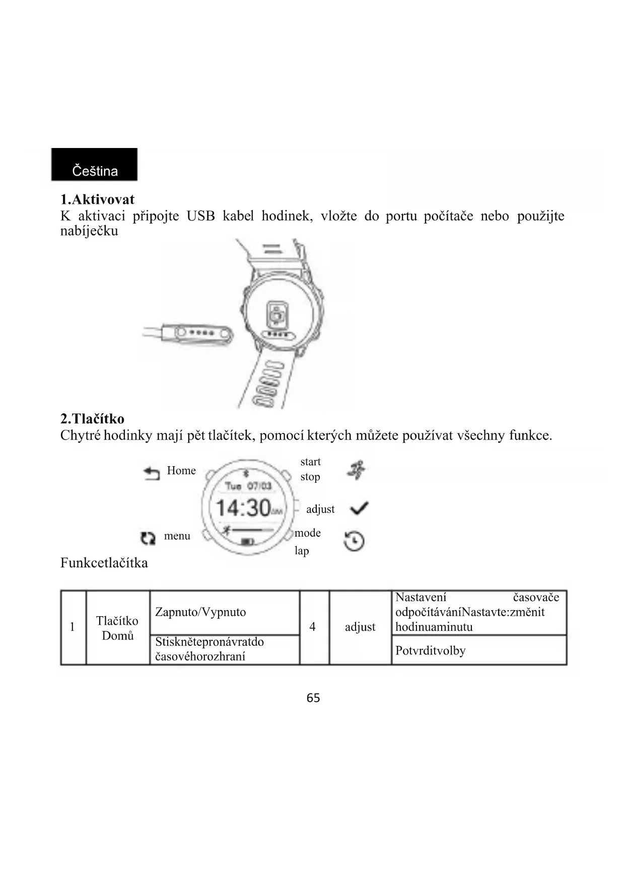 adjust Nastavení časovače odpočítávání Nastavte: změnit hodinu a minutu Stiskněte pro návrat do časového rozhraní Potvrdit volby start stop mode lap adjust menu Home Čeština66