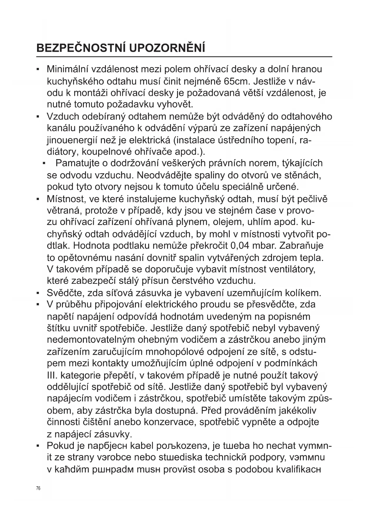 - Místnost, ve které instalujeme kuchyňský odtah, musí být pečlivě větraná, protože v případě, kdy jsou ve stejném čase v provo- zu ohřívací zařízení ohřívaná plynem, olejem, uhlím apod. ku- chyňský odtah odvádějící vzduch, by mohl v místnosti vytvořit po- dtlak. Hodnota podtlaku nemůže překročit 0,04 mbar. Zabraňuje to op ětovnému nasání dovnitř spalin vytvářených zdrojem tepla. V takovém případě se doporučuje vybavit místnost ventilátory, které zabezpečí stálý přísun čerstvého vzduchu.
