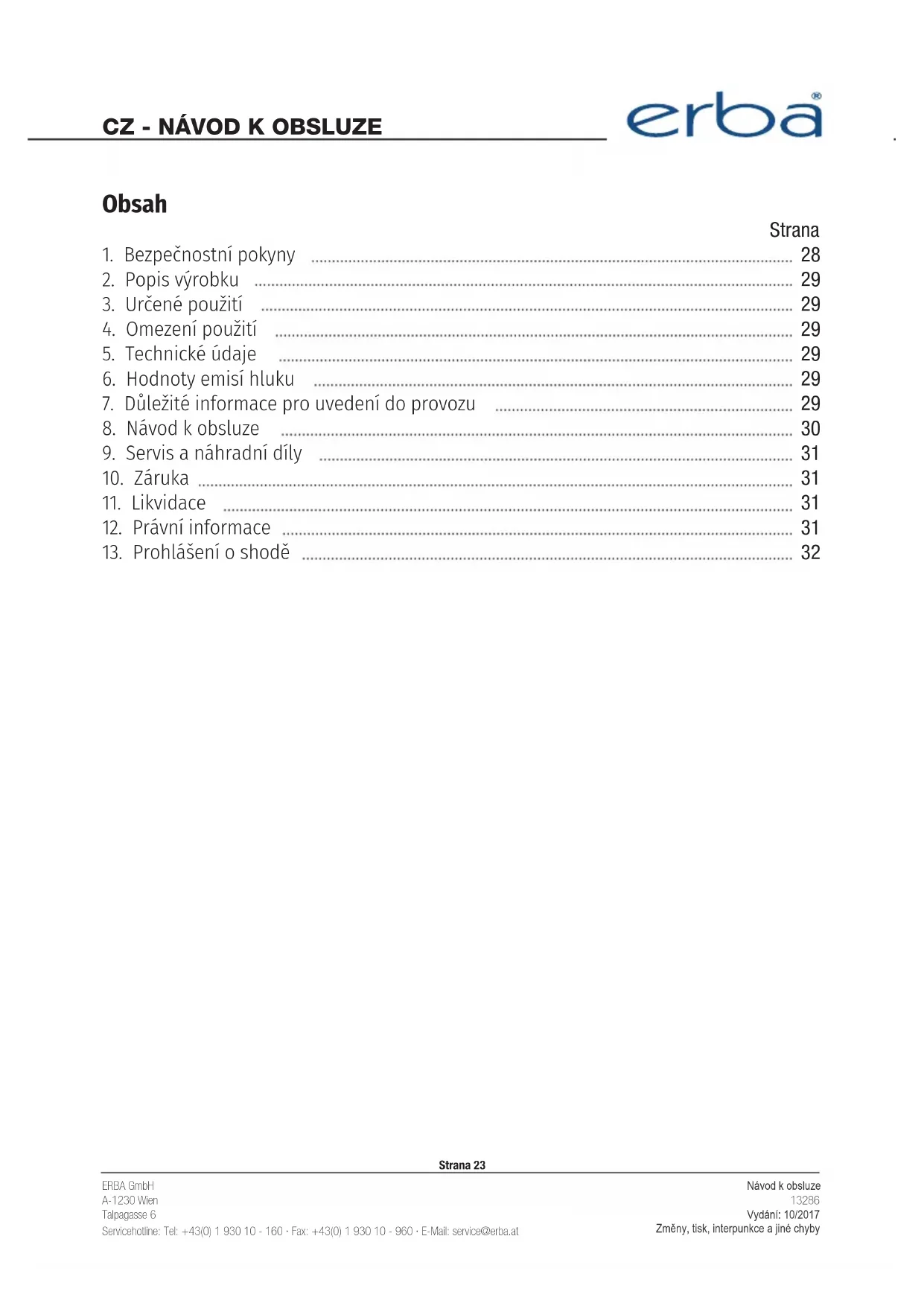 Používajte iba originálne náhradné diely. Všechna práva vyhrazena. Tato příručka je chráněna autorskými právy. Reprodukce a úpravy (digitální, tisk, atd.) jsou přísně zakázány bez předchozího písemného souhlasu společnosti ERBA GmbH. Naše výrobky jsou baleny tak, aby se zabránilo poškození při přepravě. Obalové materiály jsou cenné zdroje, a proto mohou a měly by být recyklovány. Výrobek se skládá z různých materiálů (kovy, oleje, plasty, atd.) a musí být zlikvidován s péčí a v souladu s vašimi fe- derálními a místními předpisy pro likvidaci.