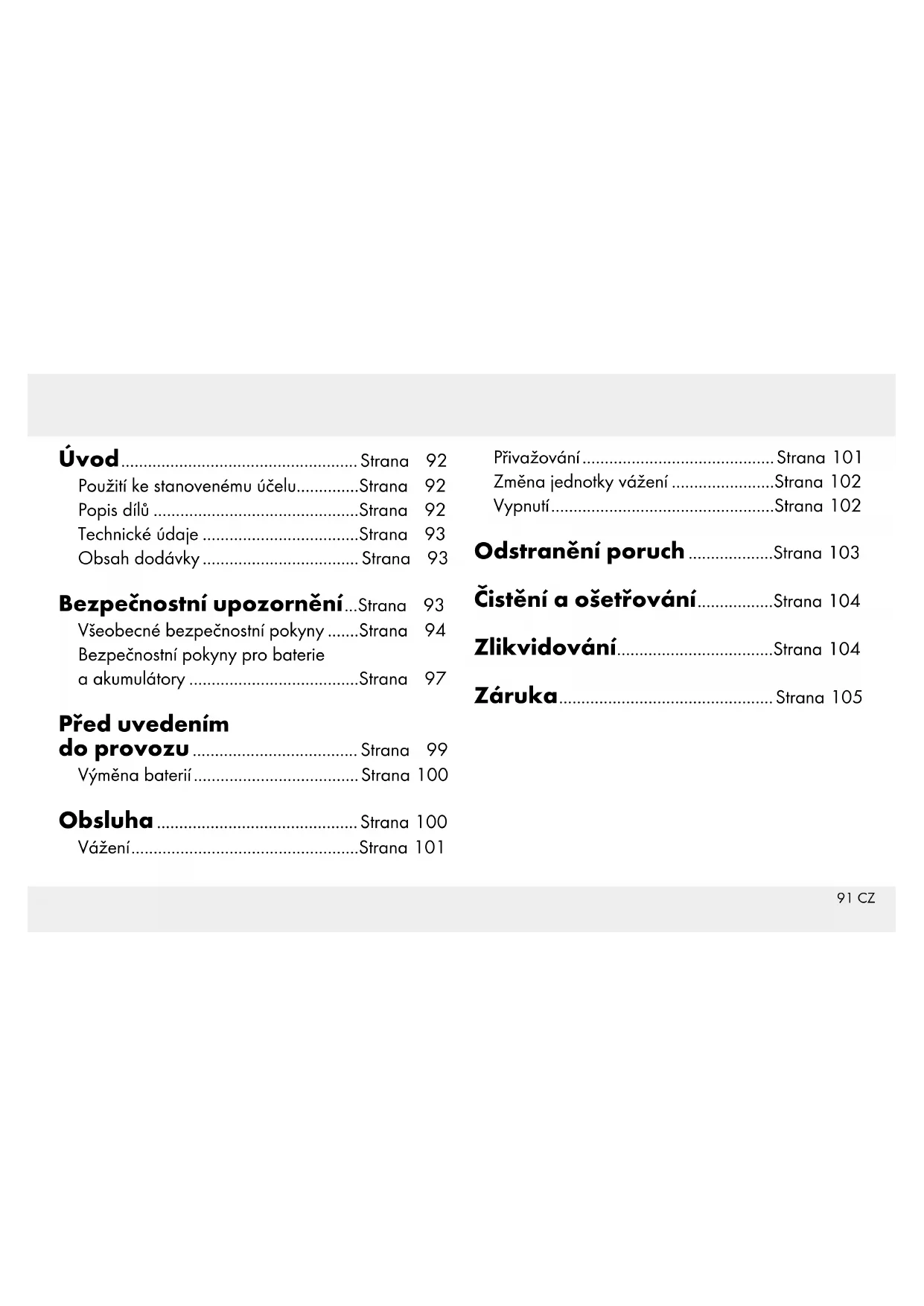 váhy chybná zobra- zení, odstraňte rušící zařízení z blízkosti výrobku. Elektrostatické výboje mohou vést k poruchám funkcí. Při těchto poruchách krátce vyndejte a znovu nasaďte baterie.104 CZ Čistění a ošetřování Neponořujte výrobek v žádném případě do vody nebo do jiných tekutin. V opačném případě může dojít k jeho poškození. Váhu čistěte lehce navlhčeným hadříkem, který nepouští vlákna. Na silného znečištění můžete použít hadr navlhčený mýdlovou vodou. Poznámka: Před uskladněním výrobek sklopte. Výrobek můžete skladovat zavěšený za závěs