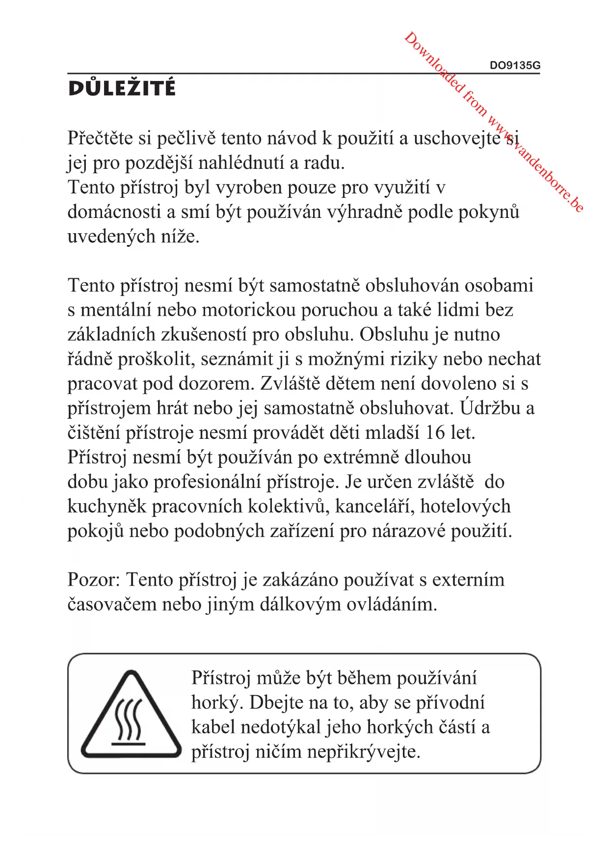 Přečtěte si pečlivě tento návod k použití a uschovejte si jej pro pozdější nahlédnutí a radu. Tento přístroj byl vyroben pouze pro využití v domácnosti a smí být používán výhradně podle pokynů uvedených níže. Tento přístroj nesmí být samostatně obsluhován osobami s mentální nebo motorickou poruchou a také lidmi bez základních zkušeností pro obsluhu. Obsluhu je nutno řádně proškolit, seznámit ji s možnými riziky nebo nechat pracovat pod dozorem. Zvláště dětem není dovoleno si s přístrojem hrát nebo jej samostatně obsluhovat. Údržbu a čištění přístroje nesmí provádět děti mladší 16 let. Přístroj nesmí být používán po extrémně dlouhou dobu jako profesionální přístroje. Je určen zvláště do kuchyněk pracovních kolektivů, kanceláří, hotelových pokojů nebo podobných zařízení pro nárazové použití. Pozor: Tento přístroj je zakázáno používat s externím časovačem nebo jiným dálkovým ovládáním. Přístroj může být během používání horký. Dbejte na to, aby se přívodní kabel nedotýkal jeho horkých částí a přístroj ničím nepřikrývejte. Downloaded from www.vandenborre.beDO9135G Přívodní kabel Kratší přívodní kabel je takto vyráběn záměrně, aby se snížilo riziko zakopnutí nebo stržení grilu ze stolu. Pokud chcete použít prodlužovací kabel, buďte vždy opatrní a vždy důkladně zkontrolujte jeho technické parametry. Vždy musí být navržen alespoň na stejné (nebo vyšší) paramerty, než je samotný spotřebič. Prodlužovací kabel vždy používejte pouze tak, aby nikde neležel a nemohl být stržen dětmi ani cizím objektem. Vždy používejte pouze 3žilový kabel se zemnícím kolíkem v zástrčce. Před prvním použitím Přístroj vybalte, zkontrolujte zda nebyl poškozen přepravou a odlepte veškeré reklamní polepy. Povrch grilu a grilovací desky otřete vlhkým hadrem. Před použitím je důkladně osušte. Nikdy nepoužívejte hrubá ani agresivní čistidla.Vyberte stabilní místo pro postavení grilu a připojte do vhodné zásuvky či prodlužovacího kabelu. Teplota vnějšího pláště se pohybuje od 50°C-70°C, proto je třeba dbát zvýšené opatrnosti při manipulaci. POPIS