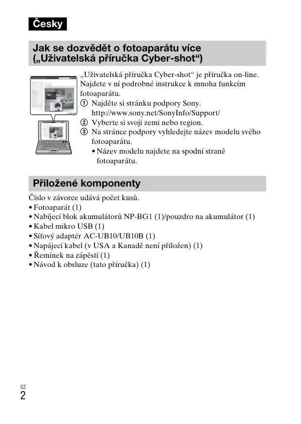Česky Jak se dozvědět o fotoaparátu více („Uživatelská příručka Cyber-shot“) „Uživatelská příručka Cyber-shot“ je příručka on-line. Najdete v ní podrobné instrukce k mnoha funkcím fotoaparátu. 1 Najděte si stránku podpory Sony. http://www.sony.net/SonyInfo/Support/ 2 Vyberte si svoji zemi nebo region. 3 Na stránce podpory vyhledejte název modelu svého fotoaparátu.