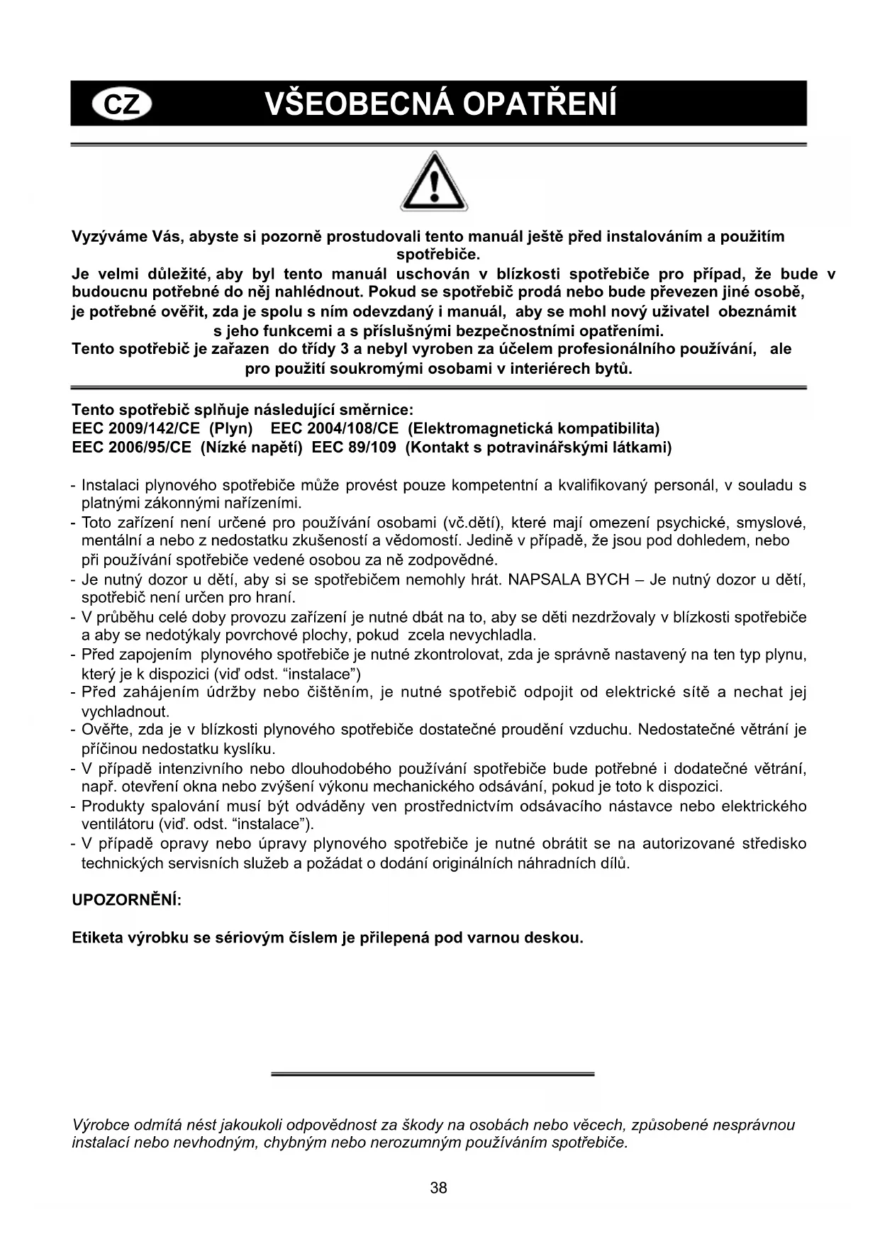Vyzýváme Vás, abyste si pozorně prostudovali tento manuál ještě před instalováním a použitím spotřebiče. Je velmi důležité, aby byl tento manuál uschován v blízkosti spotřebiče pro případ, že bude v budoucnu potřebné do něj nahlédnout. Pokud se spotřebič prodá nebo bude převezen jiné osobě, je potřebné ověřit, zda je spolu s ním odevzdaný i manuál, aby se mohl nový uživatel obeznámit s jeho funkcemi a s příslušnými bezpečnostními opatřeními. Tento spotřebič je zařazen do třídy 3 a nebyl vyroben za účelem profesionálního používání, ale pro použití soukromými osobami v interiérech bytů. Tento spotřebič splňuje následující směrnice: EEC 2009/142/CE (Plyn) EEC 2004/108/CE (Elektromagnetická kompatibilita) EEC 2006/95/CE (Nízké napětí) EEC 89/109 (Kontakt s potravinářskými látkami) - Instalaci plynového spotřebiče může provést pouze kompetentní a kvalifikovaný personál, v souladu s platnými zákonnými nařízeními. - Toto zařízení není určené pro používání osobami (vč.dětí), které mají omezení psychické, smyslové, mentální a nebo z nedostatku zkušeností a vědomostí. Jedině v případě, že jsou pod dohledem, nebo při používání spotřebiče vedené osobou za ně zodpovědné. - Je nutný dozor u dětí, aby si se spotřebičem nemohly hrát. NAPSALA BYCH – Je nutný dozor u dětí, spotřebič není určen pro hraní. - V průběhu celé doby provozu zařízení je nutné dbát na to, aby se děti nezdržovaly v blízkosti spotřebiče a aby se nedotýkaly povrchové plochy, pokud zcela nevychladla. - Před zapojením plynového spotřebiče je nutné zkontrolovat, zda je správně nastavený na ten typ plynu, který je k dispozici (viď odst. “instalace”) - Před zahájením údržby nebo čištěním, je nutné spotřebič odpojit od elektrické sítě a nechat jej vychladnout. - Ověřte, zda je v blízkosti plynového spotřebiče dostatečné proudění vzduchu. Nedostatečné větrání je příčinou nedostatku kyslíku. - V případě intenzivního nebo dlouhodobého používání spotřebiče bude potřebné i dodatečné větrání, např. otevření okna nebo zvýšení výkonu mechanického odsávání, pokud je toto k dispozici. - Produkty spalování musí být odváděny ven prostřednictvím odsávacího nástavce nebo elektrického ventilátoru (viď. odst. “instalace”). - V případě opravy nebo úpravy plynového spotřebiče je nutné obrátit se na autorizované středisko technických servisních služeb a požádat o dodání originálních náhradních dílů. UPOZORNĚNÍ: Etiketa výrobku se sériovým číslem je přilepená pod varnou deskou. Výrobce odmítá nést jakoukoli odpovědnost za škody na osobách nebo věcech, způsobené nesprávnou instalací nebo nevhodným, chybným nebo nerozumným používáním spotřebiče.39 1 Rychlý (turbo) hořák na 3000 W 2 Polorychlý hořák na 1750 W 3 Pomocný hořák na 1000 W 4 Trojitý korunkový hořák na 3800 W 5 Dvojitý korunkový hořáku na 3500 W 8 Regulační ovládací kolečko hořáku