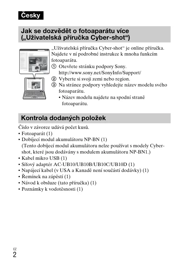 Česky Jak se dozvědět o fotoaparátu více („Uživatelská příručka Cyber-shot“) „Uživatelská příručka Cyber-shot“ je online příručka. Najdete v ní podrobné instrukce k mnoha funkcím fotoaparátu. 1 Otevřete stránku podpory Sony. http://www.sony.net/SonyInfo/Support/ 2 Vyberte si svoji zemi nebo region. 3 Na stránce podpory vyhledejte název modelu svého fotoaparátu.