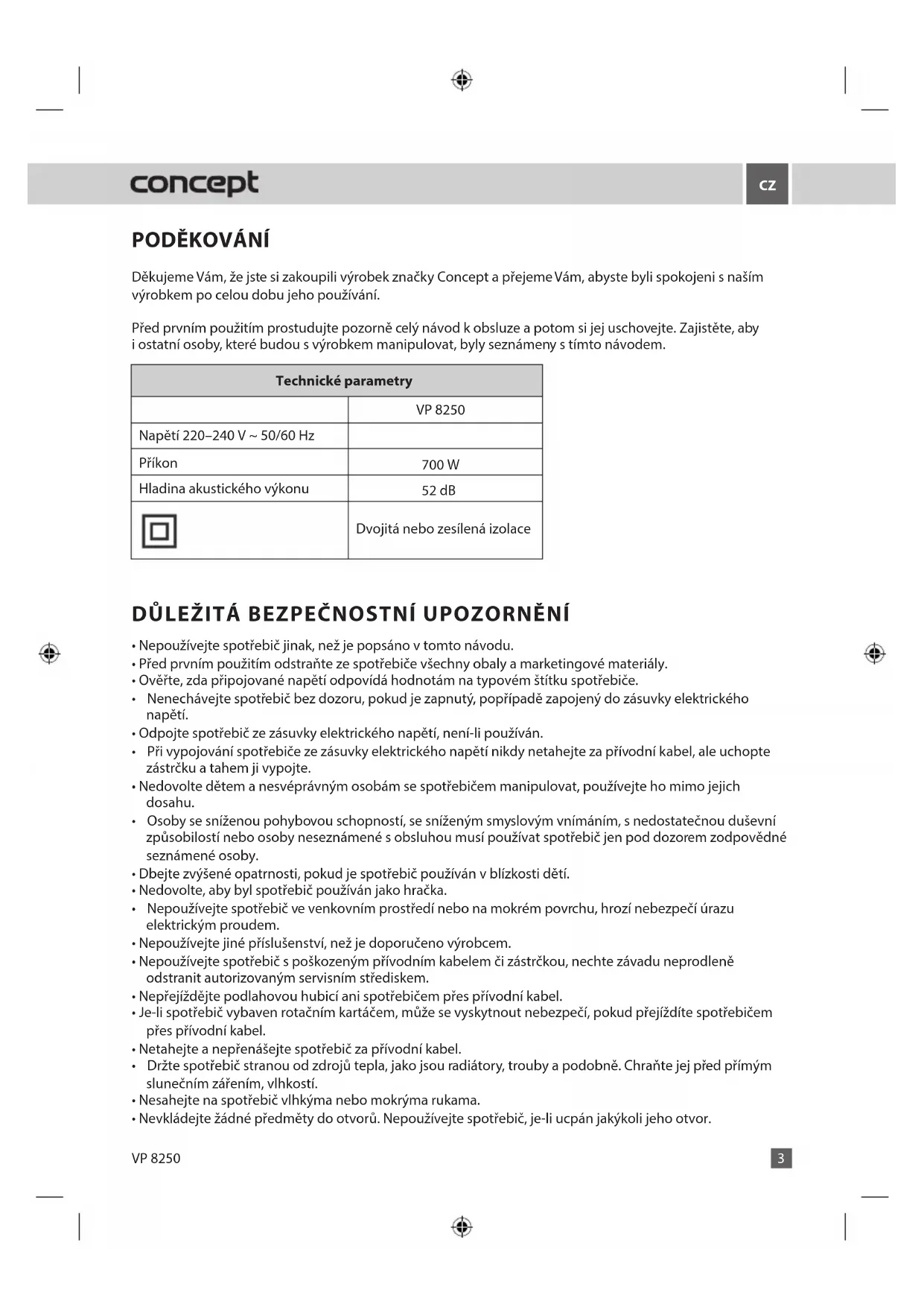 NÁVOD K OBSLUZE VP8250 Concept