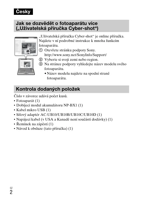 Česky Jak se dozvědět o fotoaparátu více („Uživatelská příručka Cyber-shot“) „Uživatelská příručka Cyber-shot“ je online příručka. Najdete v ní podrobné instrukce k mnoha funkcím fotoaparátu. 1 Otevřete stránku podpory Sony. http://www.sony.net/SonyInfo/Support/ 2 Vyberte si svoji zemi nebo region. 3 Na stránce podpory vyhledejte název modelu svého fotoaparátu.