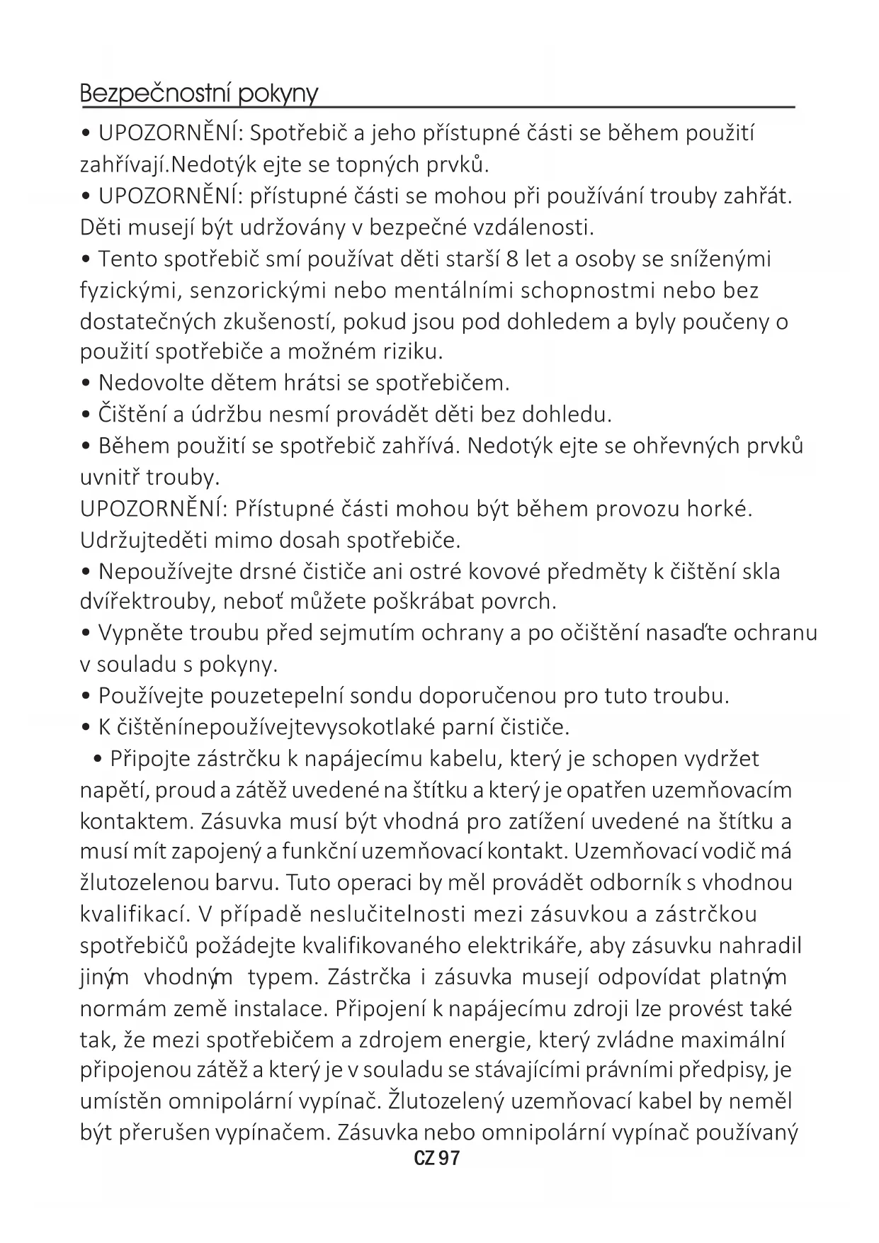 - Připojte zástrčku k napájecímu kabelu, který je schopen vydržet napětí, proud a zátěž uvedené na štítku a který je opatřen uzemňovacím kontaktem. Zásuvka musí být vhodná pro zatížení uvedené na štítku a musí mít zapojený a funkční uzemňovací kontakt. Uzemňovací vodič má žlutozelenou barvu. Tuto operaci by měl provádět odborník s vhodnou kvalifikací. V případě neslučitelnosti mezi zásuvkou a zástrčkou spotřebičů požádejte kvalifikovaného elektrikáře, aby zásuvku nahradil jiným vhodným typem. Zástrčka i zásuvka musejí odpovídat platným normám země instalace. Připojení k napájecímu zdroji lze provést také tak, že mezi spotřebičem a zdrojem energie, který zvládne maximální připojenou zátěž a který je v souladu se stávajícími právními předpisy, je umístěn omnipolární vypínač. Žlutozelený uzemňovací kabel by neměl být přerušen vypínačem. Zásuvka nebo omnipolární vypínač používaný CZ 97pro připojení by měl býtpřiinstalaci spotřebičesnadnopřístupný.