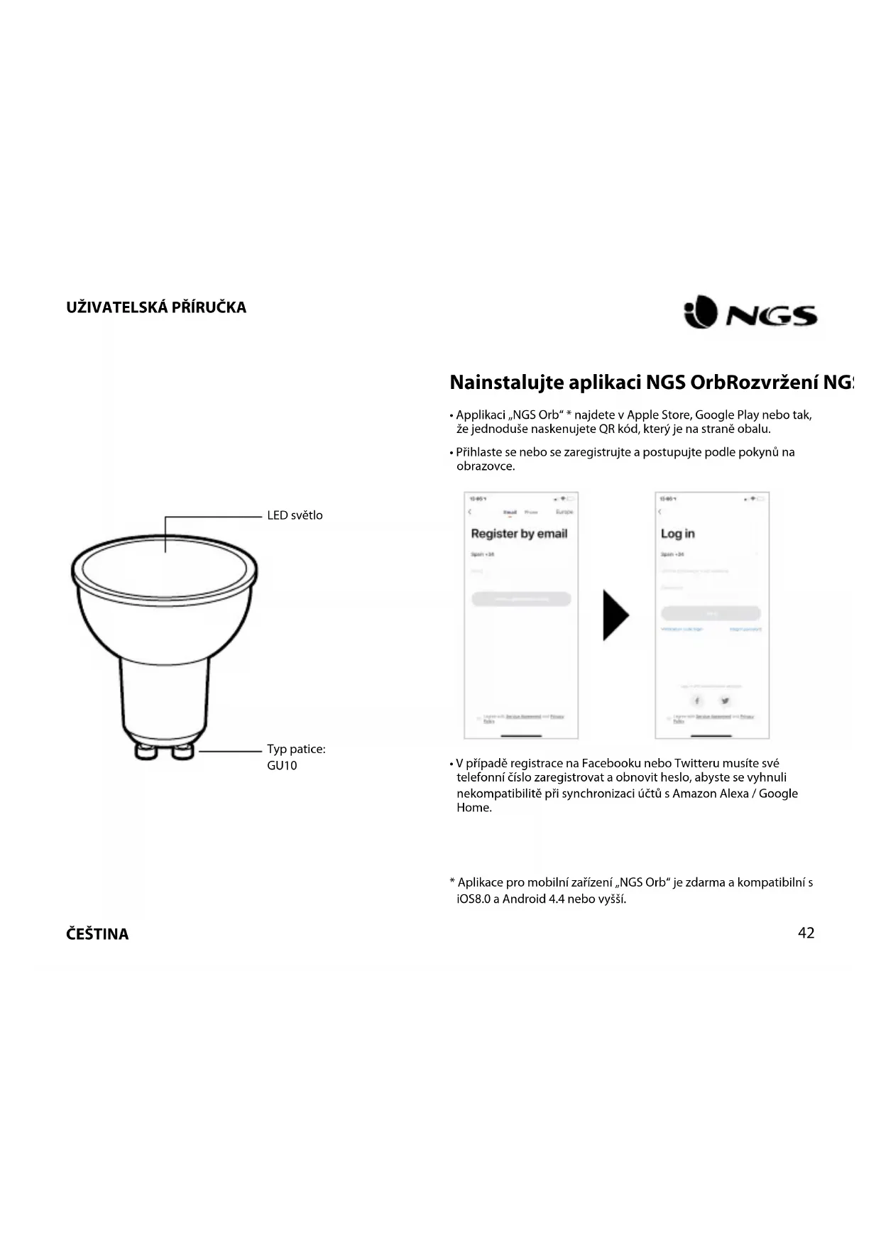 - VpřípaděregistracenaFacebookuneboTwitterumusítesvé telefonníčíslozaregistrovataobnovitheslo,abystesevyhnuli nekompatibilitěpřisynchronizaciúčtůsAmazonAlexa/Google Home. *Aplikacepromobilnízařízení„NGSOrb“jezdarmaakompatibilnís iOS8.0aAndroid4.4nebovyšší. Typpatice: GU10 LEDsvětloČEŠTINA
