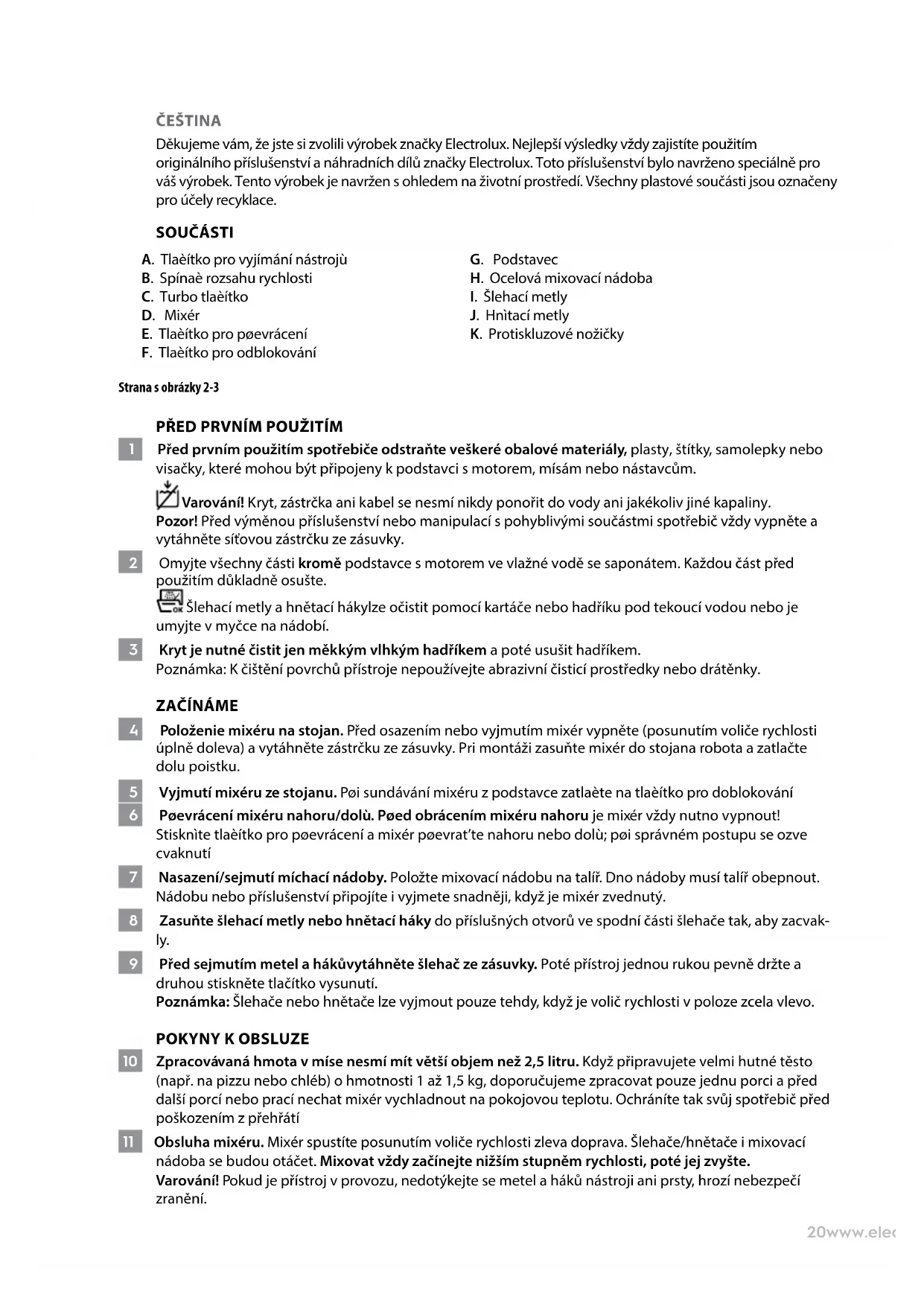 J. Hnìtací metly K. Protiskluzové nožičky Strana s obrázky 2-3 PŘED PRVNÍM POUŽITÍM 1 Před prvním použitím spotřebiče odstraňte veškeré obalové materiály, plasty, štítky, samolepky nebo visačky, které mohou být připojeny kpodstavci smotorem, mísám nebo nástavcům. Varování! Kryt, zástrčka ani kabel se nesmí nikdy ponořit do vody ani jakékoliv jiné kapaliny. Pozor! Před výměnou příslušenství nebo manipulací spohyblivými součástmi spotřebič vždy vypněte a vytáhněte síťovou zástrčku ze zásuvky. 2 Omyjte všechny části kromě podstavce smotorem ve vlažné vodě se saponátem. Každou část před použitím důkladně osušte. Šlehací metly a hnětací hákylze očistit pomocí kartáče nebo hadříku pod tekoucí vodou nebo je umyjte v myčce na nádobí. 3 Kryt je nutné čistit jen měkkým vlhkým hadříkem a poté usušit hadříkem. Poznámka: Kčištění povrchů přístroje nepoužívejte abrazivní čisticí prostředky nebo drátěnky.