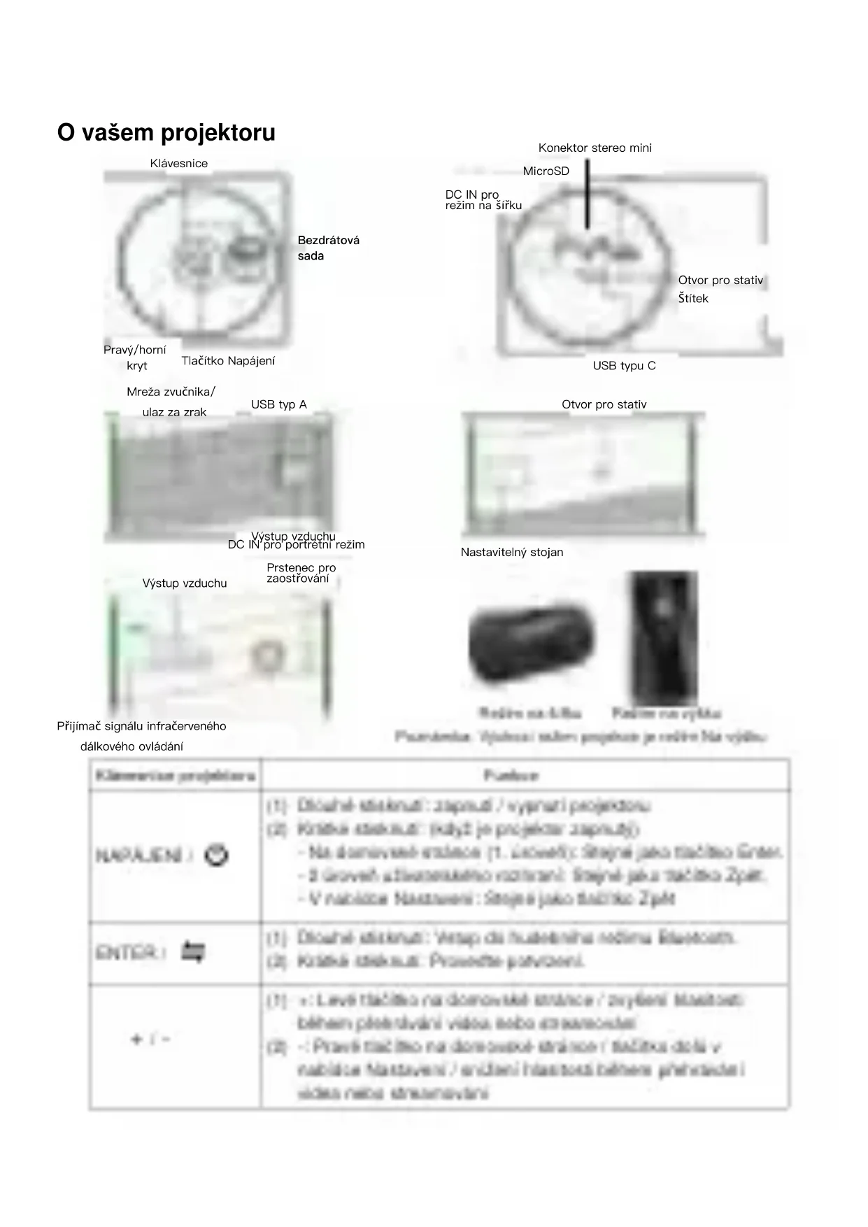 PrecautionsO vašem projektoru Dlouhé stisknutí: zapnutí / vypnutí projektoru Krátké stisknutí: (když je projektor zapnutý) - Na domovské stránce (1. úroveň): Stejné jako tlačítko Enter. - 2 úroveň uživatelského rozhraní: Stejné jako tlačítko Zpět. - V nabídce Nastavení: Stejné jako tlačítko Zpět (1) (2) (1) (2) (1) (2) Dlouhé stisknutí: Vstup do hudebního režimu Bluetooth. Krátké stisknutí: Proveďte potvrzení. +: Levé tlačítko na domovské stránce / zvýšení hlasitosti během přehrávání videa nebo streamování -: Pravé tlačítko na domovské stránce / tlačítko dolů v nabídce Nastavení / snížení hlasitosti během přehrávání videa nebo streamování NAPÁJENÍ / ENTER /