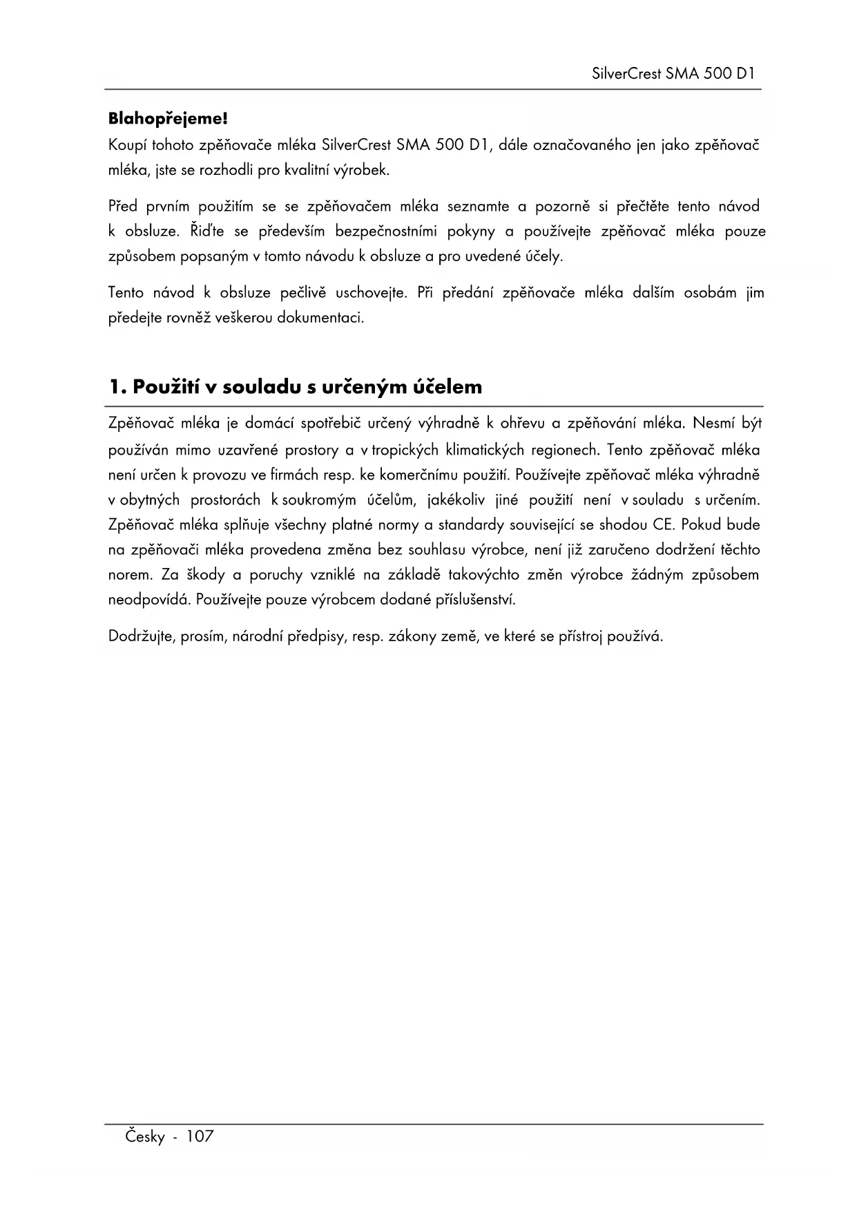 13. Informace o záruce ................................................................................... 124SilverCrest SMA 500 D1 Česky - 107 Blahopřejeme! Koupí tohoto zpěňovače mléka SilverCrest SMA 500 D1, dále označovaného jen jako zpěňovač mléka, jste se rozhodli pro kvalitní výrobek. Před prvním použitím se se zpěňovačem mléka seznamte a pozorně si přečtěte tento návod k obsluze. Řiďte se především bezpečnostními pokyny a používejte zpěňovač mléka pouze způsobem popsaným v tomto návodu k obsluze a pro uvedené účely. Tento návod k obsluze pečlivě uschovejte. Při předání zpěňovače mléka dalším osobám jim předejte rovněž veškerou dokumentaci.