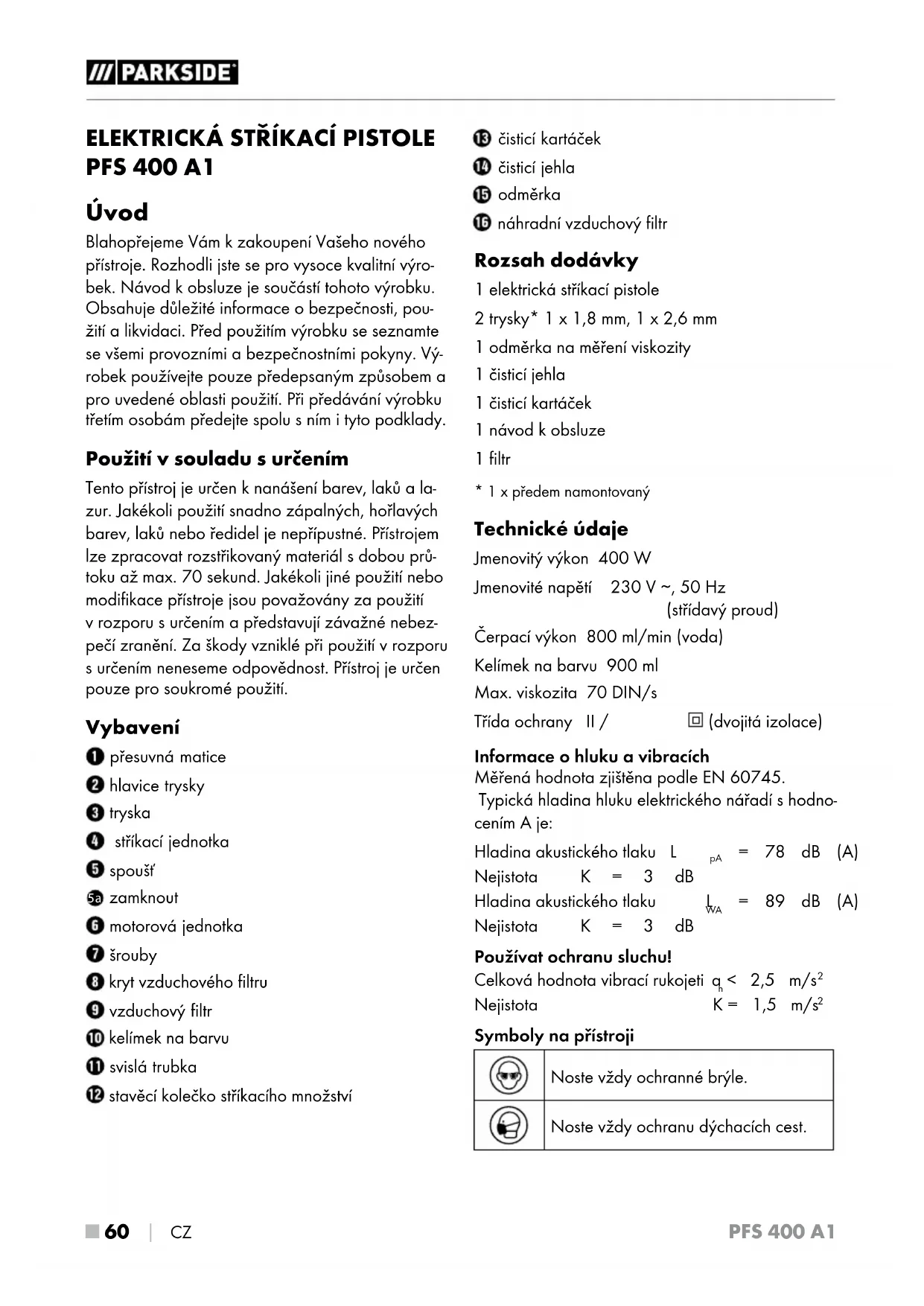 PFS 400 A1 Úvod Blahopřejeme Vám kzakoupení Vašeho nového přístroje. Rozhodli jste se pro vysoce kvalitní výro- bek. Návod kobsluze je součástí tohoto výrobku. Obsahuje důležité informace obezpečnosti, pou- žití a likvidaci. Před použitím výrobku se seznamte se všemi provozními a bezpečnostními pokyny. Vý- robek používejte pouze předepsaným způsobem a pro uvedené oblasti použití. Při předávání výrobku třetím osobám předejte spolu sním ityto podklady. Použití vsouladu surčením Tento přístroj je určen k nanášení barev, laků a la- zur. Jakékoli použití snadno zápalných, hořlavých barev, laků nebo ředidel je nepřípustné. Přístrojem lze zpracovat rozstřikovaný materiál s dobou prů- toku až max. 70 sekund. Jakékoli jiné použití nebo modifikace přístroje jsou považovány za použití vrozporu surčením a představují závažné nebez- pečí zranění. Za škody vzniklé při použití vrozporu surčením neneseme odpovědnost. Přístroj je určen pouze pro soukromé použití. Vybavení přesuvná matice hlavice trysky tryska stříkací jednotka spoušť