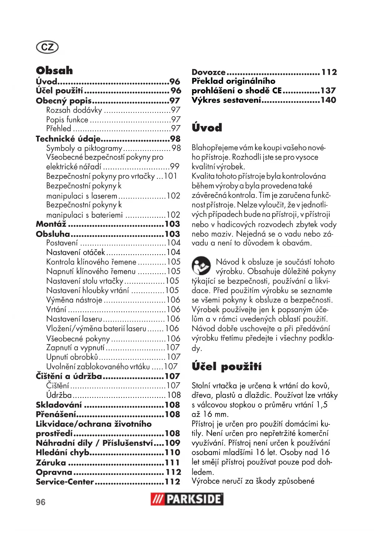 - Úvod Blahopřejeme vám ke koupi vašeho nové- ho přístroje. Rozhodli jste se pro vysoce kvalitní výrobek. Kvalita tohoto přístroje byla kontrolována během výroby a byla provedena také závěrečná kontrola. Tím je zaručena funkč- nost přístroje. Nelze vyloučit, že v jednotli- vých případech bude na přístroji, v přístroji nebo v hadicových rozvodech zbytek vody nebo maziv. Nejedná se o vadu nebo zá- vadu a není to důvodem k obavám. Návod k obsluze je součástí tohoto výrobku. Obsahuje důležité pokyny týkající se bezpečnosti, používání a likvi- dace. Před použitím výrobku se seznamte se všemi pokyny k obsluze a bezpečnosti. Výrobek používejte jen k popsaným úče- lům a v rámci uvedených oblastí použití. Návod dobře uschovejte a při předávání výrobku třetímu předejte i všechny podkla- dy. Účel použití Stolní vrtačka je určena k vrtání do kovů, dřeva, plastů a dlaždic. Používat lze vrtáky s válcovou stopkou o průměru vrtání 1,5 až 16 mm. Přístroj je určen pro použití domácími ku- tily. Není určen pro nepřetržité komerční využívání. Přístroj není určen k používání osobami mladšími 16 let. Osoby nad 16 let smějí přístroj používat pouze pod doh- ledem. Výrobce neručí za škody způsobené Překladoriginálního prohlášeníoshoděCE p. 137