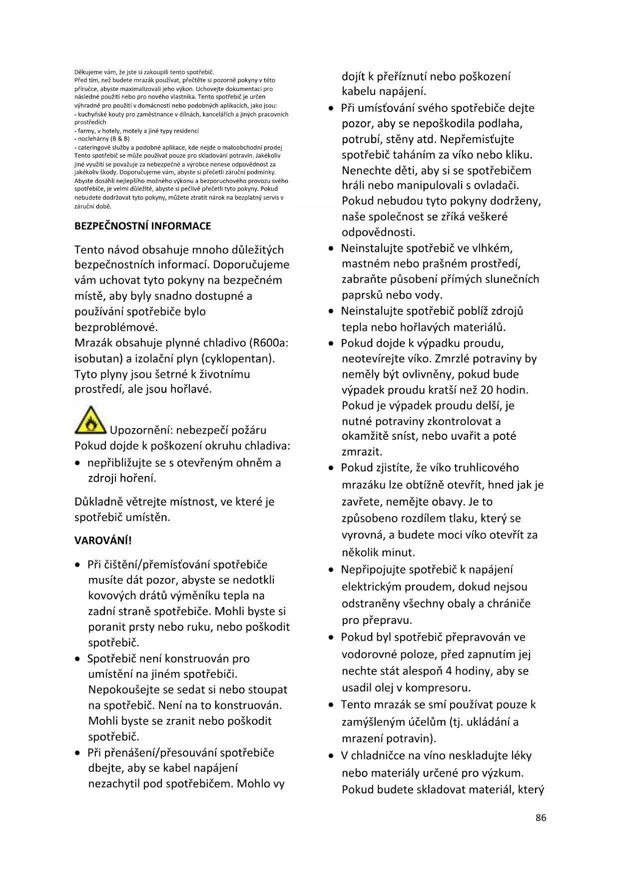 Tento návod obsahuje mnoho důležitých bezpečnostních informací. Doporučujeme vám uchovat tyto pokyny na bezpečném místě, aby byly snadno dostupné a používání spotřebiče bylo bezproblémové. Mrazák obsahuje plynné chladivo (R600a: isobutan) a izolační plyn (cyklopentan). Tyto plyny jsou šetrné k životnímu prostředí, ale jsou hořlavé. Upozornění: nebezpečí požáru Pokud dojde k poškození okruhu chladiva: