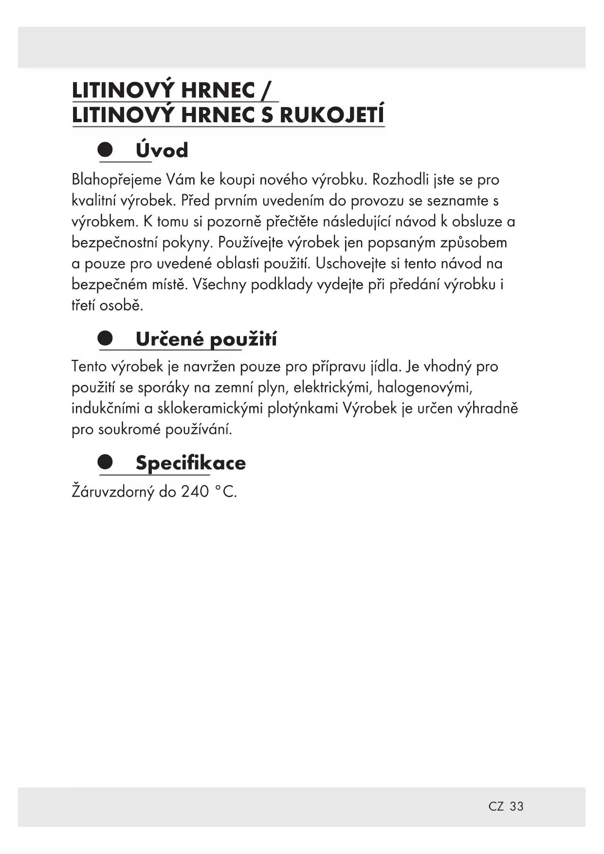 Úvod Blahopřejeme Vám ke koupi nového výrobku. Rozhodli jste se pro kvalitní výrobek. Před prvním uvedením do provozu se seznamte s výrobkem. K tomu si pozorně přečtěte následující návod k obsluze a bezpečnostní pokyny. Používejte výrobek jen popsaným způsobem a pouze pro uvedené oblasti použití. Uschovejte si tento návod na bezpečném místě. Všechny podklady vydejte při předání výrobku i třetí osobě. Určené použití Tento výrobek je navržen pouze pro přípravu jídla. Je vhodný pro použití se sporáky na zemní plyn, elektrickými, halogenovými, indukčními a sklokeramickými plotýnkami Výrobek je určen výhradně pro soukromé používání. Specifikace Žáruvzdorný do 240 °C.34