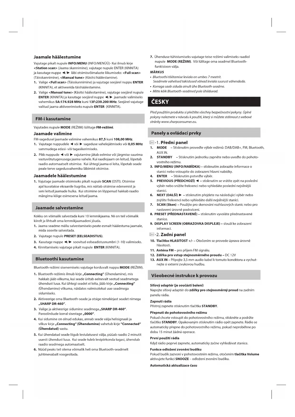 - Mitte kõik Bluetooth-seadmed pole ühilduvad. ČESKY Před použitím produktu si přečtěte všechny bezpečnostní pokyny. Úplné pokyny naleznete v návodu k použití, který si můžete stáhnout z webové stránky www.sharpconsumer.eu. Panely a ovládací prvky -1. Přední panel