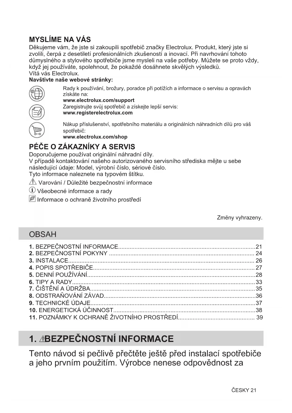 Děkujeme vám, že jste si zakoupili spotřebič značky Electrolux. Produkt, který jste si zvolili, čerpá z desetiletí profesionálních zkušeností a inovací. Při navrhování tohoto důmyslného a stylového spotřebiče jsme mysleli na vaše potřeby. Můžete se proto vždy, když jej používáte, spolehnout, že pokaždé dosáhnete skvělých výsledků. Vítá vás Electrolux. Navštivte naše webové stránky:Rady k používání, brožury, poradce při potížích a informace o servisu a opraváchzískáte na:www.electrolux.com/supportZaregistrujte svůj spotřebič a získejte lepší servis:www.registerelectrolux.comNákup příslušenství, spotřebního materiálu a originálních náhradních dílů pro vášspotřebič:www.electrolux.com/shop PÉČE O ZÁKAZNÍKY A SERVIS Doporučujeme používat originální náhradní díly. V případě kontaktování našeho autorizovaného servisního střediska mějte u sebe následující údaje: Model, výrobní číslo, sériové číslo. Tyto informace naleznete na typovém štítku. Varování / Důležité bezpečnostní informace Všeobecné informace a rady Informace o ochraně životního prostředí Zmĕny vyhrazeny. OBSAH