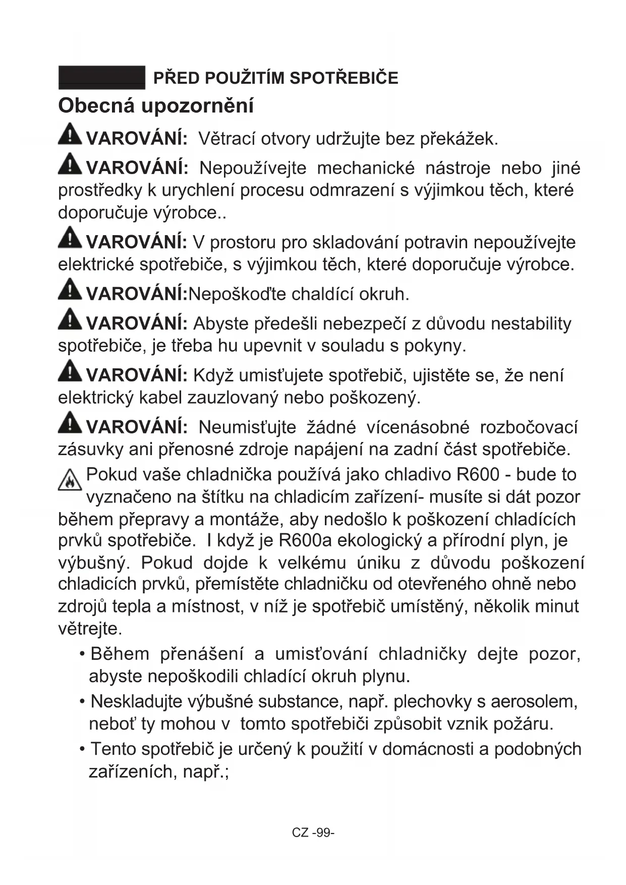 - ČÁSTI SPOTŘEBIČE A PŘÍSLUŠENSTVÍ CZ -99- PŘED POUŽITÍM SPOTŘEBIČE ČÁST - 1. Obecná upozornění VAROVÁNÍ: Větrací otvory udržujte bez překážek. VAROVÁNÍ: Nepoužívejte mechanické nástroje nebo jiné prostředky k urychlení procesu odmrazení s výjimkou těch, které doporučuje výrobce VAROVÁNÍ: V prostoru pro skladování potravin nepoužívejte elektrické spotřebiče, s výjimkou těch, které doporučuje výrobce. VAROVÁNÍ:Nepoškoďte chaldící okruh. VAROVÁNÍ: Abyste předešli nebezpečí z důvodu nestability spotřebiče, je třeba hu upevnit v souladu s pokyny. VAROVÁNÍ: Když umisťujete spotřebič, ujistěte se, že není elektrický kabel zauzlovaný nebo poškozený. VAROVÁNÍ: Neumisťujte žádné vícenásobné rozbočovací zásuvky ani přenosné zdroje napájení na zadní část spotřebiče. Pokud vaše chladnička používá jako chladivo R600 - bude to vyznačeno na štítku na chladicím zařízení- musíte si dát pozor během přepravy a montáže, aby nedošlo k poškození chladících prvků spotřebiče. I když je R600a ekologický a přírodní plyn, je výbušný. Pokud dojde k velkému úniku z důvodu poškození chladicích prvků, přemístěte chladničku od otevřeného ohně nebo zdrojů tepla a místnost, v níž je spotřebič umístěný, několik minut větrejte. p. 119