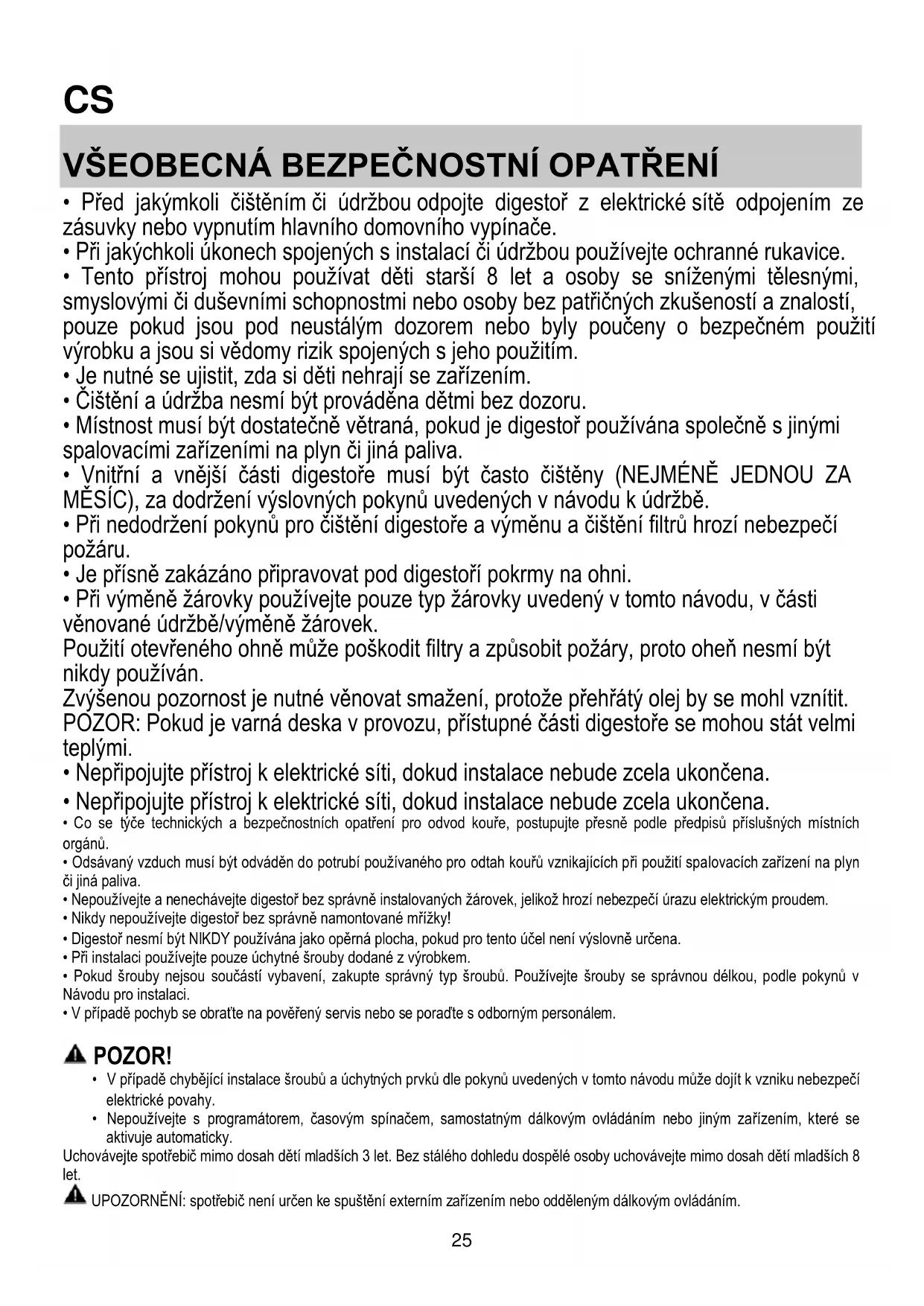 - Při výměně žárovky používejte pouze typ žárovky uvedený v tomto návodu, v části věnované údržbě/výměně žárovek. Použití otevřeného ohně může poškodit filtry a způsobit požáry, proto oheň nesmí být nikdy používán. Zvýšenou pozornost je nutné věnovat smažení, protože přehřátý olej by se mohl vznítit. POZOR: Pokud je varná deska v provozu, přístupné části digestoře se mohou stát velmi teplými.