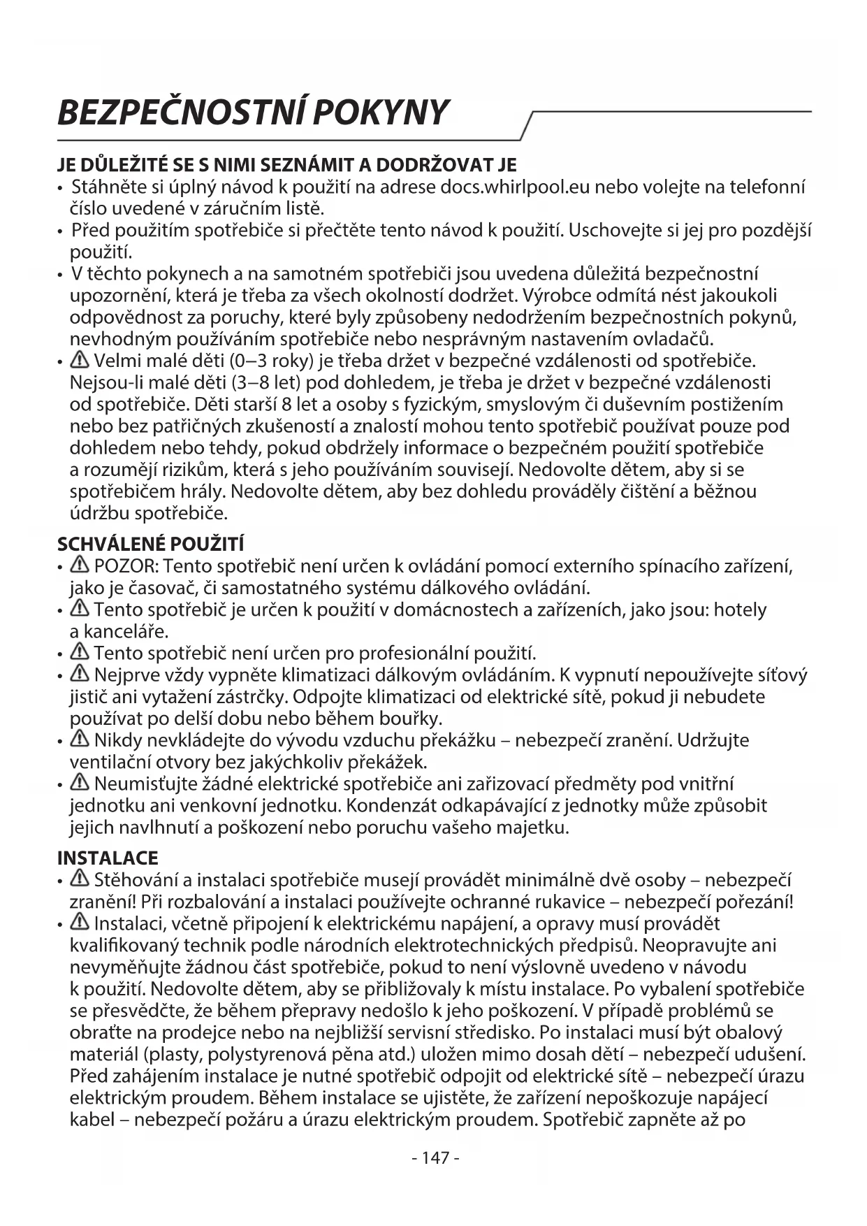 Instalaci, včetně připojení kelektrickému napájení, aopravy musí provádět kvalikovaný technik podle národních elektrotechnických předpisů. Neopravujte ani nevyměňujte žádnou část spotřebiče, pokud to není výslovně uvedeno vnávodu kpoužití. Nedovolte dětem, aby se přibližovaly kmístu instalace. Po vybalení spotřebiče se přesvědčte, že během přepravy nedošlo kjeho poškození. Vpřípadě problémů se obraťte na prodejce nebo na nejbližší servisní středisko. Po instalaci musí být obalový materiál (plasty, polystyrenová pěna atd.) uložen mimo dosah dětí – nebezpečí udušení. Před zahájením instalace je nutné spotřebič odpojit od elektrické sítě – nebezpečí úrazu elektrickým proudem. Během instalace se ujistěte, že zařízení nepoškozuje napájecí kabel – nebezpečí požáru aúrazu elektrickým proudem. Spotřebič zapněte až po