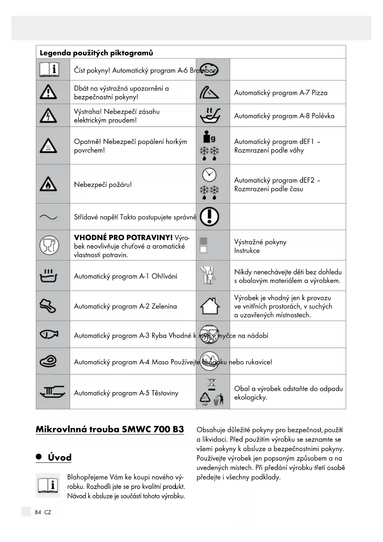 PAP Obal a výrobek odstaňte do odpadu ekologicky. Mikrovlnná trouba SMWC 700 B3 Úvod Blahopřejeme Vám ke koupi nového vý- robku. Rozhodli jste se pro kvalitní prod ukt. Návod kobsluze je součástí tohoto výrobku. Obsahuje důležité pokyny pro bezpečnost, použití a likvidaci. Před použitím výrobku se seznamte se všemi pokyny k obsluze a bezpečnostními pokyny. Používejte výrobek jen popsaným způsobem a na uvedených místech. Při předání výrobku třetí osobě předejte i všechny podklady.85 CZ Použití ke stanovenému účelu Tento výrobek je vhodný na rozmrazení, ohřátí a přípravu potravin za provozu jen ve vnitřních pro- storách. Výrobek se smí používat jen na ohřívání k tomu vhodných potravin ve vhodných nádobách a nádobí. Výrobek je určen pouze k privátnímu použití, není vhodný kvýdělečné činnosti. Výrobek použí- vejte výhradně ke stanovenému účelu. Jiné než zde předem popsané použití anebo změna výrobku ne- jsou přípustné a mohou vést ke zraněním nebo po- škození výrobku. Za škody způsobené použitím k nestanovenému účelu nepřevezme výrobce záruku. Výrobek je vhodný výhradně kprovozu ve vnitřních prostorech, vsuchých a uza- vřených místnostech. Popis dílů Mikrovlnná trouba