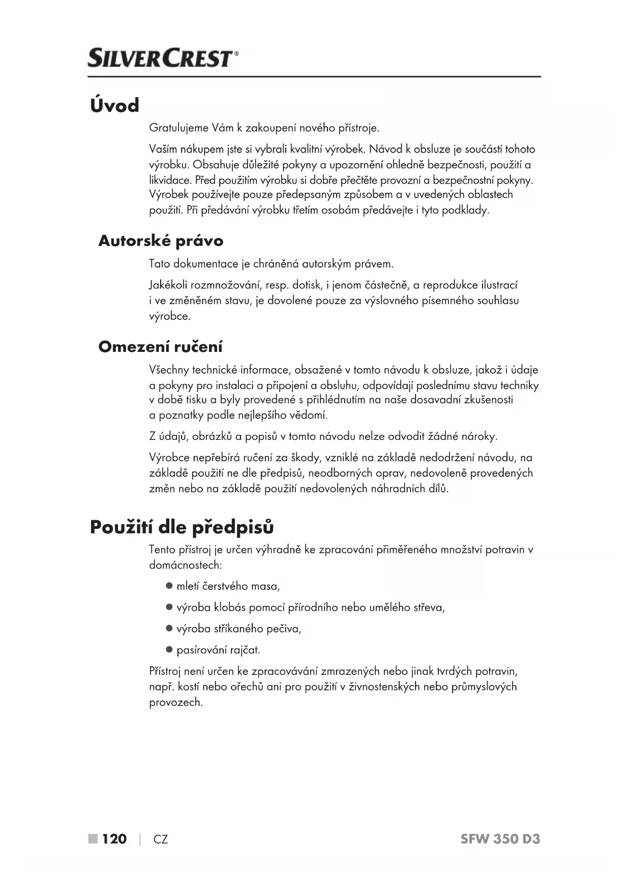 CZ SFW 350 D3 Úvod Gratulujeme Vám k zakoupení nového přístroje. Vaším nákupem jste si vybrali kvalitní výrobek. Návod k obsluze je součástí tohoto výrobku. Obsahuje důležité pokyny a upozornění ohledně bezpečnosti, použití a likvidace. Před použitím výrobku si dobře přečtěte provozní a bezpečnostní pokyny. Výrobek používejte pouze předepsaným způsobem a v uvedených oblastech použití. Při předávání výrobku třetím osobám předávejte i tyto podklady. Autorské právo Tato dokumentace je chráněná autorským právem. Jakékoli rozmnožování, resp. dotisk, i jenom částečně, a reprodukce ilustrací i ve změněném stavu, je dovolené pouze za výslovného písemného souhlasu výrobce. Omezení ručení Všechny technické informace, obsažené v tomto návodu k obsluze, jakož i údaje a pokyny pro instalaci a připojení a obsluhu, odpovídají poslednímu stavu techniky v době tisku a byly provedené s přihlédnutím na naše dosavadní zkušenosti a poznatky podle nejlepšího vědomí. Z údajů, obrázků a popisů v tomto návodu nelze odvodit žádné nároky. Výrobce nepřebírá ručení za škody, vzniklé na základě nedodržení návodu, na základě použití ne dle předpisů, neodborných oprav, nedovoleně provedených změn nebo na základě použití nedovolených náhradních dílů. Použití dle předpisů Tento přístroj je určen výhradně ke zpracování přiměřeného množství potravin v domácnostech: ▯ mletí čerstvého masa, ▯ výroba klobás pomocí přírodního nebo umělého střeva, ▯ výroba stříkaného pečiva, ▯ pasírování rajčat. Přístroj není určen ke zpracovávání zmrazených nebo jinak tvrdých potravin, např. kostí nebo ořechů ani pro použití v živnostenských nebo průmyslových provozech. IB_314659_SFW350D3_LB8.indb 120 21.01.19 14:54CZ