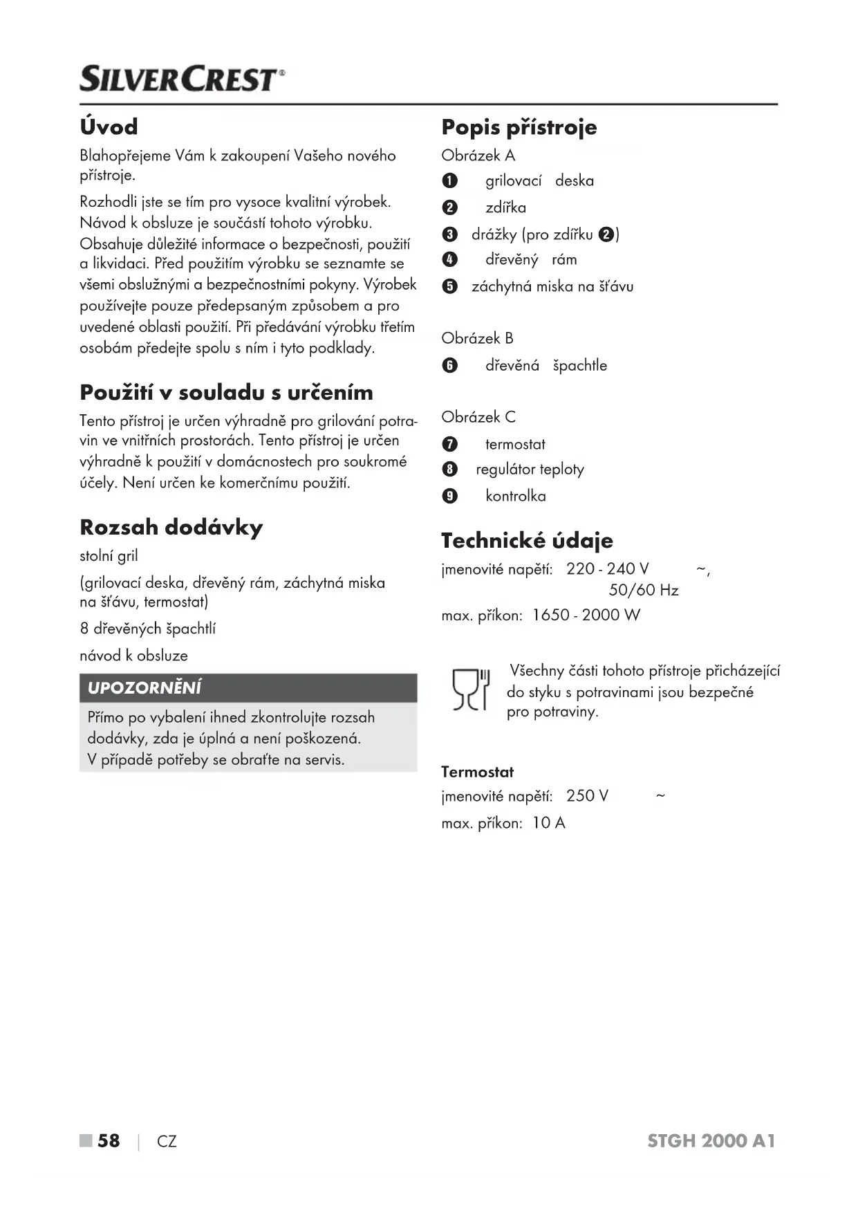 - Bruschetta ■ 58 │ CZ STGH 2000 A1 Úvod Blahopřejeme Vám kzakoupení Vašeho nového přístroje. Rozhodli jste se tím pro vysoce kvalitní výrobek. Návod kobsluze je součástí tohoto výrobku. Obsahuje důležité informace obezpečnosti, použití a likvidaci. Před použitím výrobku se seznamte se všemi obslužnými a bezpečnostními pokyny. Výrobek používejte pouze předepsaným způsobem a pro uvedené oblasti použití. Při předávání výrobku třetím osobám předejte spolu sním ityto podklady. Použití vsouladu surčením Tento přístroj je určen výhradně pro grilování potra- vin ve vnitřních prostorách. Tento přístroj je určen výhradně kpoužití vdomácnostech pro soukromé účely. Není určen ke komerčnímu použití. Rozsah dodávky stolní gril (grilovací deska, dřevěný rám, záchytná miska na šťávu, termostat) 8 dřevěných špachtlí návod k obsluze UPOZORNĚNÍ Přímo po vybalení ihned zkontrolujte rozsah dodávky, zda je úplná a není poškozená. Vpřípadě potřeby se obraťte na servis. Popis přístroje ObrázekA grilovací deska zdířka drážky (pro zdířku ) dřevěný rám záchytná miska na šťávu ObrázekB dřevěná špachtle ObrázekC termostat regulátor teploty kontrolka Technické údaje jmenovité napětí: 220 - 240 V p. 70