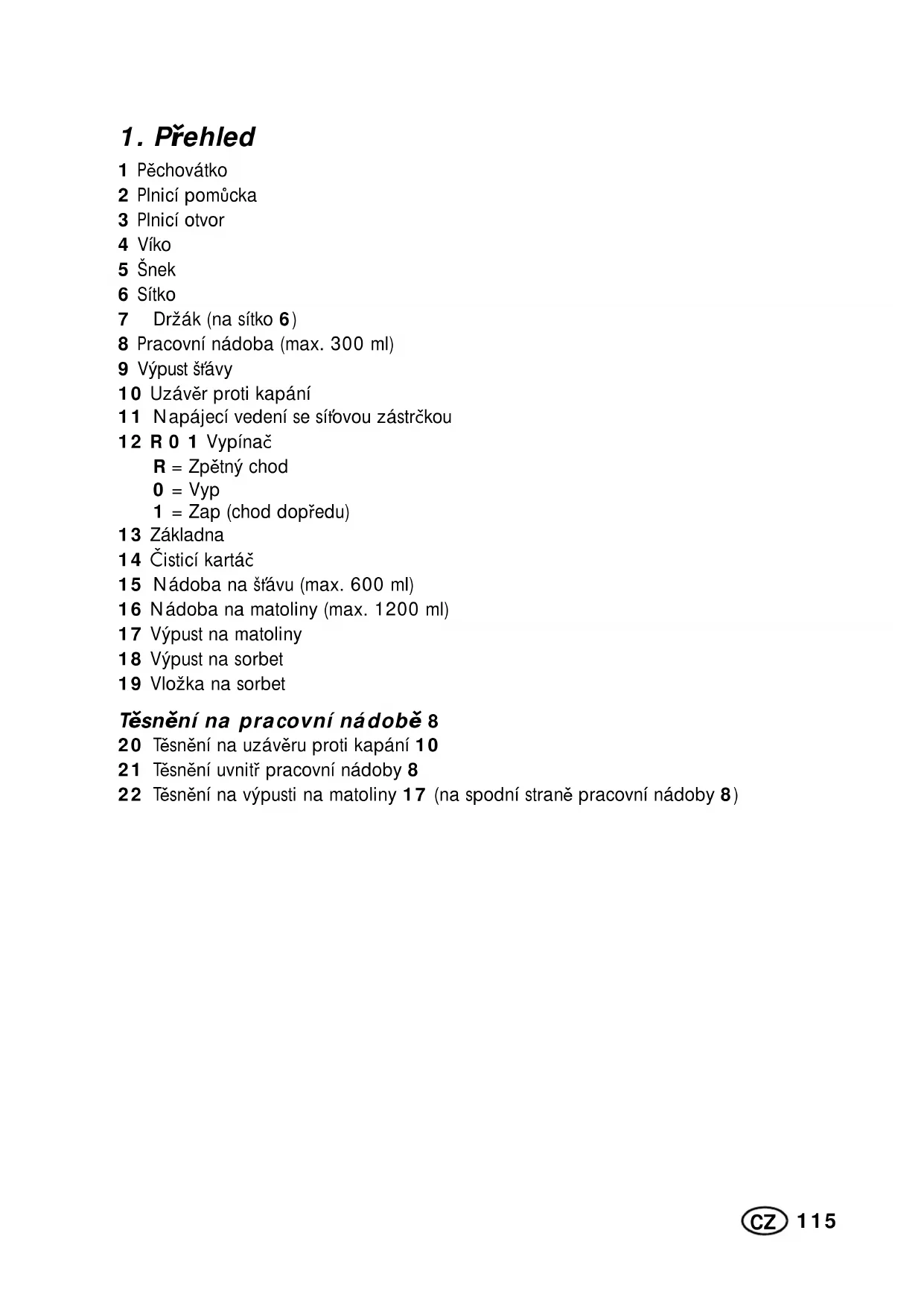 1 Pøchovátko 2 Plnicí pomŃcka 3 Plnicí otvor 4 Víko 5 Šnek 6 Sítko 7 Držák (na sítko|6) 8 Pracovní nádoba (max. 300 ml) 9 Výpust šĹávy 10 Uzávør proti kapání 11 Napájecí vedení se síĹovou zástrêkou 12 R 0 1 Vypínaê R = Zpøtný chod 0 = Vyp 1 = Zap (chod dopįedu) 13 Základna 14 éisticí kartáê 15 Nádoba na šĹávu (max. 600 ml) 16 Nádoba na matoliny (max. 1200 ml) 17 Výpust na matoliny 18 Výpust na sorbet 19 Vložka na sorbet Tøsnøní na pracovní nádobø|8 20 Tøsnøní na uzávøru proti kapání|10 21 Tøsnøní uvnitį pracovní nádoby|8 22 Tøsnøní na výpusti na matoliny|17 (na spodní stranø pracovní nádoby|8)116