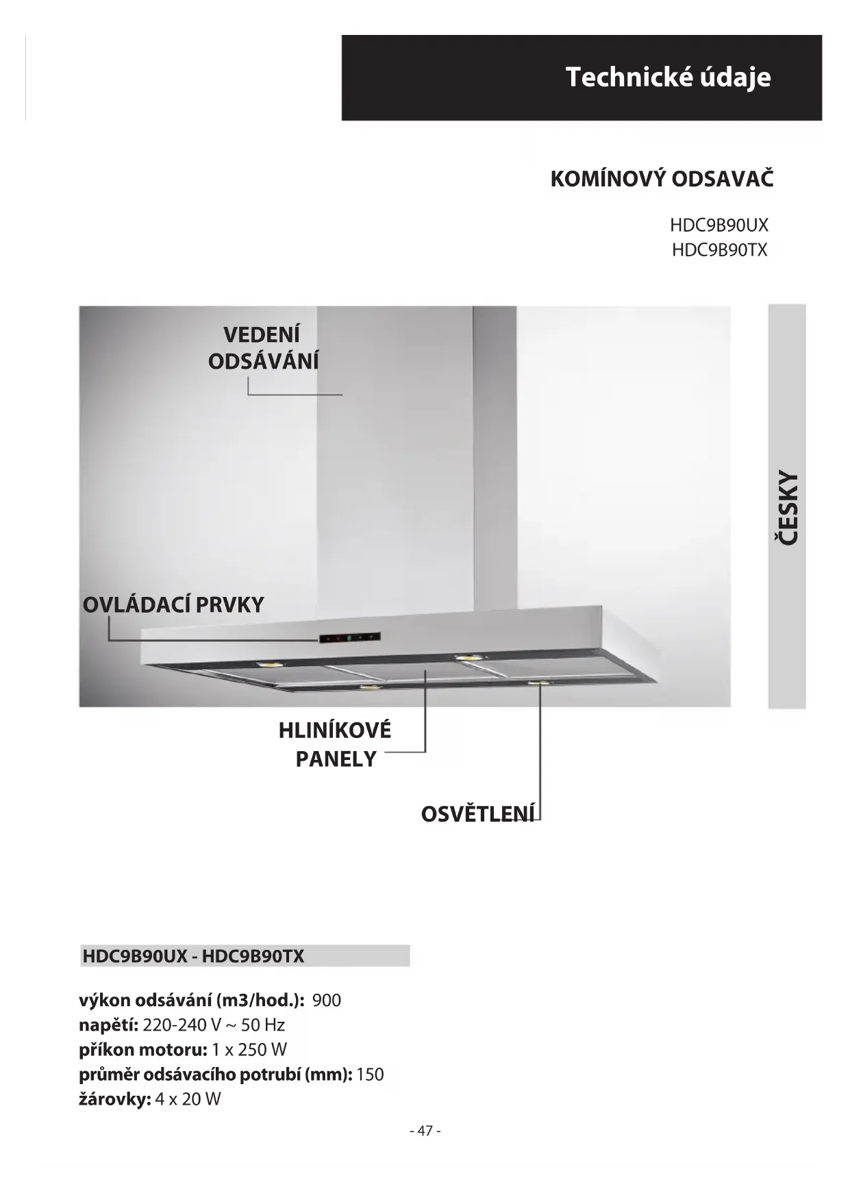 HLINÍKOVÉ PANELY OSVĚTLENÍ výkon odsávání (m3/hod.): 900 napětí: 220-240 V ~ 50 Hz příkon motoru: 1 x 250 W průměr odsávacího potrubí (mm): 150 žárovky: 4 x 20 W- 48 - ČESKY