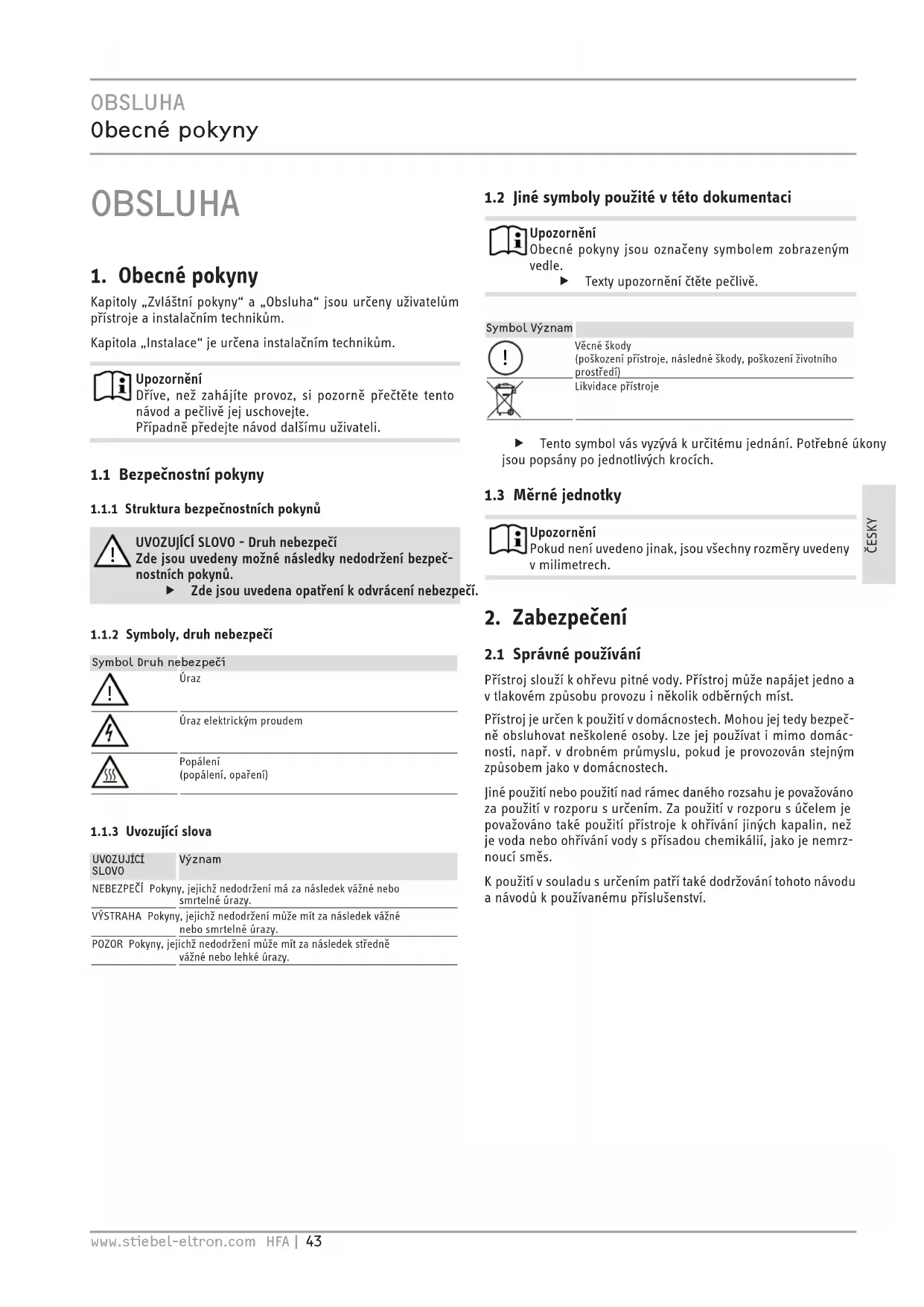Údaje ohydraulickém systému Jmenovitý objem l 30 80 80 100 100 150 Množství smíšené vody 40 °C (15 °C/65°C) l 58 158 155 195 195 290 Elektrotechnické údaje Příkon ~ 230 V kW 2-4 2-4 2-4 2-4 2-4 2-4 Příkon ~ 400V kW 2-6 2-6 2-6 2-6 2-6 2-6 Fáze 1/N/PE, 2/N/PE, 3/N/PE, 3/PE 1/N/PE, 2/N/PE, 3/N/PE, 3/PE 1/N/PE, 2/N/PE, 3/N/PE, 3/PE 1/N/PE, 2/N/PE, 3/N/PE, 3/PE 1/N/PE, 2/N/PE, 3/N/PE, 3/PE 1/N/PE, 2/N/PE, 3/N/PE, 3/PE Jmenovité napětí V 230/400 230/400 230/400 230/400 230/400 230/400 Frekvence Hz 50/- 50/- 50/- 50/- 50/- 50/- Jednookruhový provozní režim X X X X X X Dvouokruhový provozní režim X X X X X X Režim jednorázového ohřevu X X X X X Xwww.stiebel-eltron.com HFA | 53 ČESKY INSTALACE | ZÁRUKA | ŽIVOTNÍ PROSTŘEDÍ A RECYKLACE Technické údaje HFA-Z 30 HFA-Z 80 HFA/EB 80 Z HFA 100 Z HFA-Z 100 HFA-Z 150 Meze použitelnosti Rozsah nastavení teplot °C 35-82 35-82 35-82 35-82 35-82 35-82 Max. dovolený tlak MPa 0,6 0,6 0,6 0,6 0,6 0,6 Zkušební tlak MPa 0,78 0,78 0,78 0,78 0,78 0,78 Maximální dovolená teplota °C 95 95 95 95 95 95 Max. průtok l/min 18 18 18 18 18 18 Vodivost pitné vody min./max. μS/cm 100-1500 100-1500 100-1500 100-1500 100-1500 100-1500 Energetické údaje Tepelná ztráta / 24 h při 65 °C kWh 0,46 0,75 1,1 1,4 0,9 1,3 Třída energetické účinnosti B C C C C C Provedení Krytí (IP) IP24 IP24 IP24 IP24 IP24 IP24 Tlakové provedení X X X X X X Beztlakové provedení X X X X X X Barva bílá bílá bílá bílá bílá bílá Rozměry Výška mm 770 975 1020 1210 975 1280 Šířka mm 410 510 410 410 510 510 Hloubka mm 420 510 420 420 510 510 Hmotnosti Hmotnost při naplnění kg 52,6 113 116 141,5 137,5 199 Vlastní hmotnost kg 22,6 33 36 41,5 37,5 49 Záruka Pro přístroje nabyté mimo území Německa neplatí záruční podmínky poskytované našimi rmami vNěmecku. Vzemích, ve kterých některá znašich dceřiných společností distribuuje naše výrobky, poskytuje záruku jenom tato dceřiná společnost. Takovou záruku lze poskytnout pouze tehdy, pokud dceřiná společnost vydala vlastní záruční podmínky. Jinak nelze záruku poskytnout. Na přístroje zakoupené vzemích, ve kterých nejsou naše vý- robky distribuovány žádnou zdceřiných společností, nepo- skytujeme žádnou záruku. Případné záruky závazně přislíbené dovozcem zůstávají proto nedotčené. Životní prostředí a recyklace Pomozte nám chránit naše životní prostředí. Materiály po pou- žití zlikvidujte v souladu s platnými národními předpisy. ZÁRUKA ŽIVOTNÍ PROSTŘEDÍ A RECYKLACE54 | HFA www.stiebel-eltron.com СОДЕРЖАНИЕ | СПЕЦИАЛЬНЫЕ УКАЗАНИЯ СПЕЦИАЛЬНЫЕ УКАЗАНИЯ ЭКСПЛУАТАЦИЯ