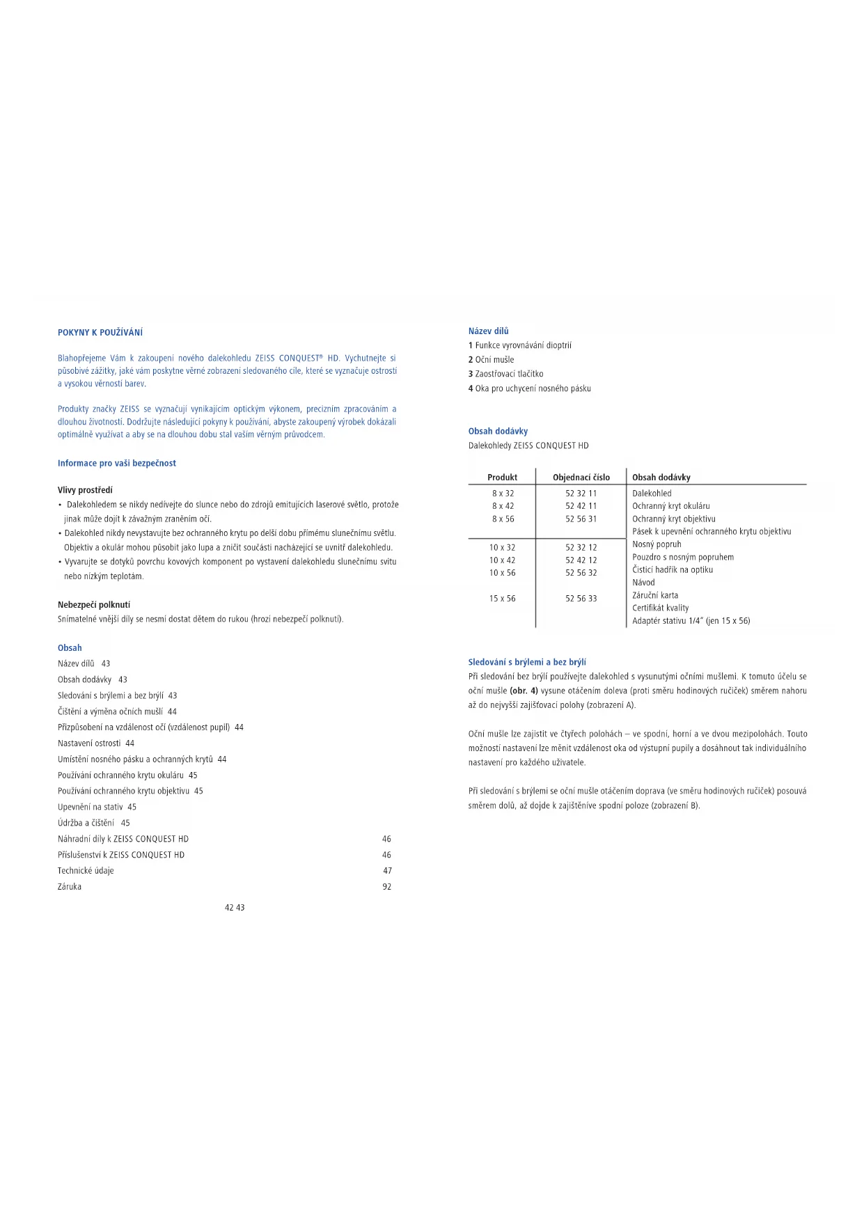 HD. Vychutnejte si působivé zážitky, jaké vám poskytne věrné zobrazení sledovaného cíle, které se vyznačuje ostrostí a vysokou věrností barev. Produkty značky ZEISS se vyznačují vynikajícím optickým výkonem, precizním zpracováním a dlouhou životností. Dodržujte následující pokyny k používání, abyste zakoupený výrobek dokázali optimálně využívat a aby se na dlouhou dobu stal vaším věrným průvodcem. Informace pro vaši bezpečnost Vlivy prostředí Dalekohledem se nikdy nedívejte do slunce nebo do zdrojů emitujících laserové světlo, protože jinak může dojít k závažným zraněním očí. Dalekohled nikdy nevystavujte bez ochranného krytu po delší dobu přímému slunečnímu světlu. Objektiv a okulár mohou působit jako lupa a zničit součásti nacházející se uvnitř dalekohledu. Vyvarujte se dotyků povrchu kovových komponent po vystavení dalekohledu slunečnímu svitu nebo nízkým teplotám. Nebezpečí polknutí Snímatelné vnější díly se nesmí dostat dětem do rukou (hrozí nebezpečí polknutí). Obsah Název dílů 43 Obsah dodávky 43 Sledování s brýlemi a bez brýlí 43 Čištění a výměna očních mušlí 44 Přizpůsobení na vzdálenost očí (vzdálenost pupil) 44 Nastavení ostrosti 44 Umístění nosného pásku a ochranných krytů 44 Používání ochranného krytu okuláru 45 Používání ochranného krytu objektivu 45 Upevnění na stativ 45 Údržba a čištění 45 Náhradní díly k ZEISS CONQUEST HD 46 Příslušenství k ZEISS CONQUEST HD 46 Technické údaje 47 Záruka 92 Název dílů 1 Funkce vyrovnávání dioptrií 2 Oční mušle 3 Zaostřovací tlačítko 4 Oka pro uchycení nosného pásku Obsah dodávky Dalekohledy ZEISS CONQUEST HD Produkt Objednací číslo Obsah dodávky 8 x 32 8 x 42 8 x 56