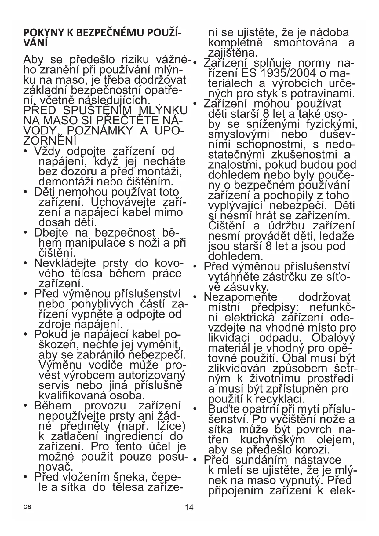 VÁNÍ Aby se předešlo riziku vážné- ho zranění při používání mlýn- ku na maso, je třeba dodržovat základní bezpečnostní opatře- ní, včetně následujících. PŘED SPUŠTĚNÍM MLÝNKU NA MASO SI PŘEČTĚTE NÁ-