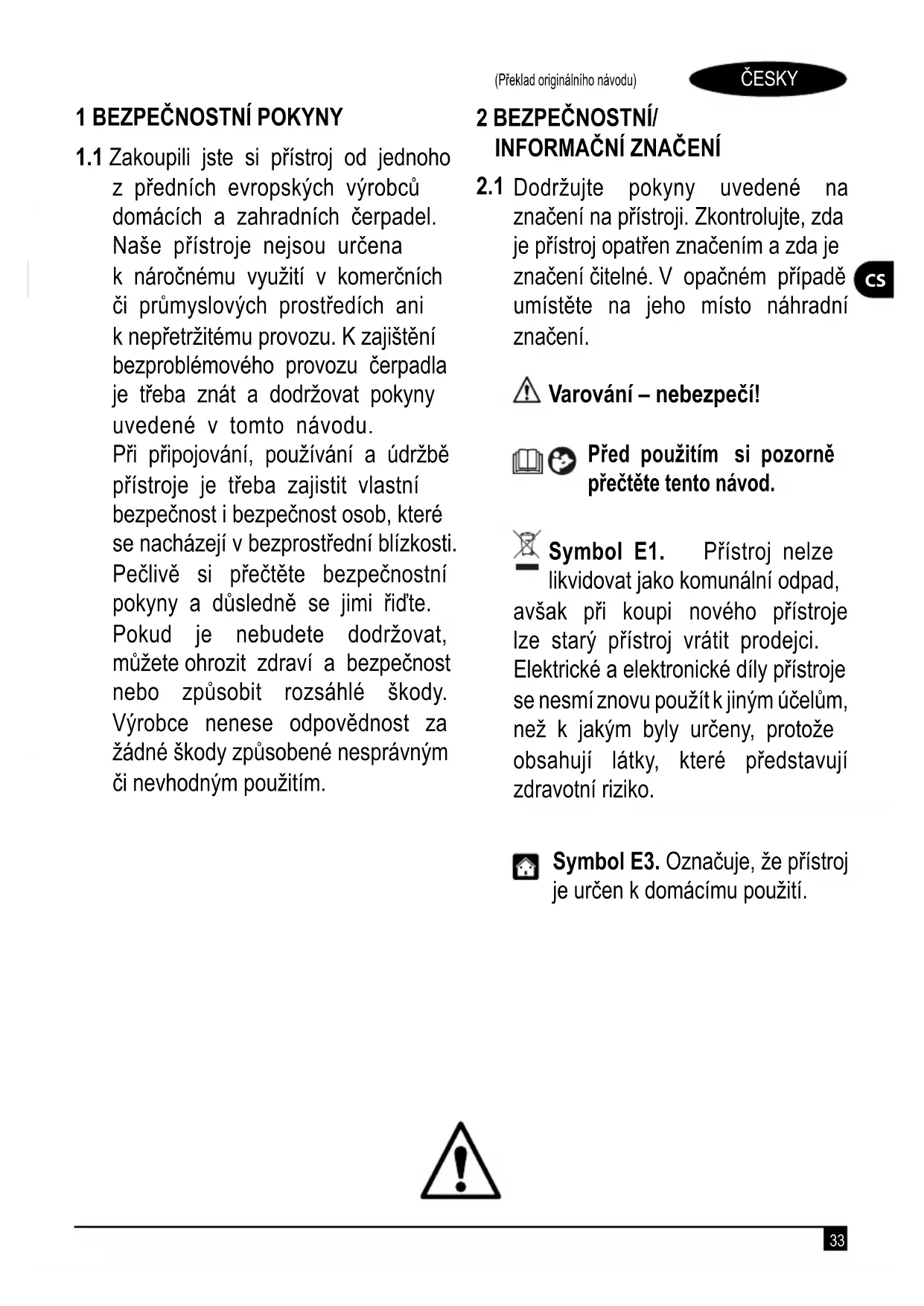 Dodržujte pokyny uvedené na značení na přístroji. Zkontrolujte, zda je přístroj opatřen značením a zda je značení čitelné. V opačném případě umístěte na jeho místo náhradní značení. Varování – nebezpečí! Před použitím si pozorně přečtěte tento návod. Symbol E1. Přístroj nelze likvidovat jako komunální odpad, avšak při koupi nového přístroje lze starý přístroj vrátit prodejci. Elektrické a elektronické díly přístroje se nesmí znovu použít k jiným účelům, než k jakým byly určeny, protože obsahují látky, které představují zdravotní riziko. Symbol E3. Označuje, že přístroj je určen k domácímu použití.34 ČESKY (Překlad originálního návodu)