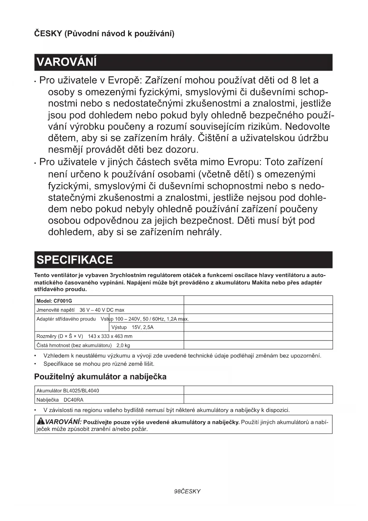 - ProuživatelevjinýchčástechsvětamimoEvropu:Totozařízení neníurčenokpoužíváníosobami(včetnědětí)somezenými fyzickými,smyslovýmičiduševnímischopnostminebosnedo- statečnýmizkušenostmiaznalostmi,jestliženejsoupoddohle- demnebopokudnebylyohledněpoužívánízařízenípoučeny osobouodpovědnouzajejichbezpečnost.Dětimusíbýtpod dohledem,abysisezařízenímnehrály. SPECIFIKACE Tento ventilátor je vybaven 3rychlostním regulátorem otáček a funkcemi oscilace hlavy ventilátoru a auto- matického časovaného vypínání. Napájení může být prováděno z akumulátoru Makita nebo přes adaptér střídavého proudu. Model: CF001GJmenoviténapětí 36 V – 40 V DC maxAdaptérstřídavéhoproudu Vstup 100 – 240V, 50 / 60Hz, 1,2A max.Výstup 15V, 2,5ARozměry(D׊×V) 143 x 333 x 463 mmČistáhmotnost(bezakumulátoru) 2,0 kg
