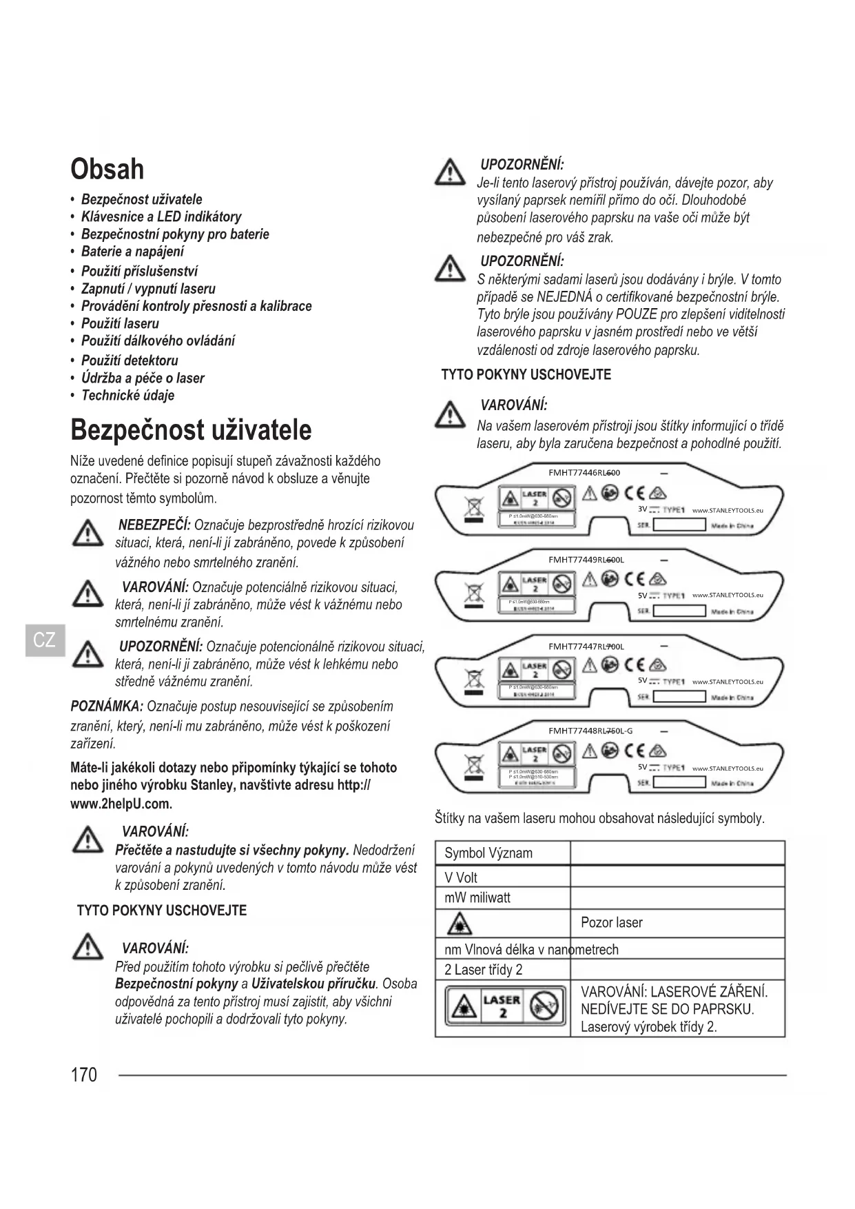 www.STANLEYTOOLS.euP ≤1.0mW@630-680nmP ≤1.0mW@510-530nm Štítky na vašem laseru mohou obsahovat následující symboly. Symbol Význam V Volt mW miliwatt Pozor laser nm Vlnová délka v nanometrech 2 Laser třídy 2 VAROVÁNÍ: LASEROVÉ ZÁŘENÍ. NEDÍVEJTE SE DO PAPRSKU. Laserový výrobek třídy 2.171