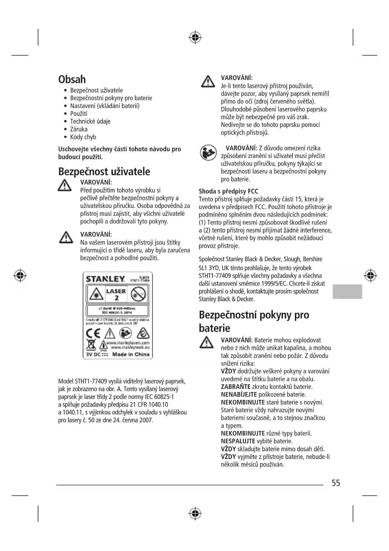 - Kódy chyb Uschovejte všechny části tohoto návodu pro budoucí použití. Bezpečnost uživatele VAROVÁNÍ: Před použitím tohoto výrobku si pečlivě přečtěte bezpečnostní pokyny a uživatelskou příručku. Osoba odpovědná za přístroj musí zajistit, aby všichni uživatelé pochopili a dodržovali tyto pokyny. VAROVÁNÍ: Na vašem laserovém přístroji jsou štítky informující o třídě laseru, aby byla zaručena bezpečnost a pohodlné použití. Model STHT1-77409 vysílá viditelný laserový paprsek, jak je zobrazeno na obr. A. Tento vysílaný laserový paprsek je laser třídy 2 podle normy IEC 60825-1 a splňuje požadavky předpisu 21 CFR 1040.10 a 1040.11, s výjimkou odchylek v souladu s vyhláškou pro lasery č. 50 ze dne 24. června 2007. VAROVÁNÍ: Je-li tento laserový přístroj používán, dávejte pozor, aby vysílaný paprsek nemířil přímo do očí (zdroj červeného světla). Dlouhodobé působení laserového paprsku může být nebezpečné pro váš zrak. Nedívejte se do tohoto paprsku pomocí optických přístrojů. VAROVÁNÍ: Z důvodu omezení rizika způsobení zranění si uživatel musí přečíst uživatelskou příručku, pokyny týkající se bezpečnosti laseru a bezpečnostní pokyny pro baterie. Shoda s předpisy FCC Tento přístroj splňuje požadavky části 15, která je uvedena v předpisech FCC. Použití tohoto přístroje je podmíněno splněním dvou následujících podmínek: (1) Tento přístroj nesmí způsobovat škodlivé rušení a (2) tento přístroj nesmí přijímat žádné interference, včetně rušení, které by mohlo způsobit nežádoucí provoz přístroje. Společnost Stanley Black & Decker, Slough, Bershire SL1 3YD, UK tímto prohlašuje, že tento výrobek STHT1-77409 splňuje všechny požadavky a všechna další ustanovení směrnice 1999/5/EC. Chcete-li získat prohlášení o shodě, kontaktujte prosím společnost Stanley Black & Decker. Bezpečnostní pokyny pro baterie VAROVÁNÍ: Baterie mohou explodovat nebo z nich může unikat kapalina, a mohou tak způsobit zranění nebo požár. Z důvodu snížení rizika: VŽDY dodržujte veškeré pokyny a varování uvedené na štítku baterie a na obalu. ZABRAŇTE zkratu kontaktů baterie. NENABÍJEJTE poškozené baterie. NEKOMBINUJTE staré baterie s novými. Staré baterie vždy nahrazujte novými bateriemi současně, a to stejnou značkou a typem. NEKOMBINUJTE různé typy baterií. NESPALUJTE vybité baterie. VŽDY skladujte baterie mimo dosah dětí. VŽDY vyjměte z přístroje baterie, nebude-li několik měsíců používán. 55POZNÁMKA: Ujistěte se, zda jsou používány doporučené baterie. POZNÁMKA: Ujistěte se, zda jsou baterie vloženy do přístroje správným způsobem a zda je dodržena správná polarita. Nastavení (vkládání baterií)