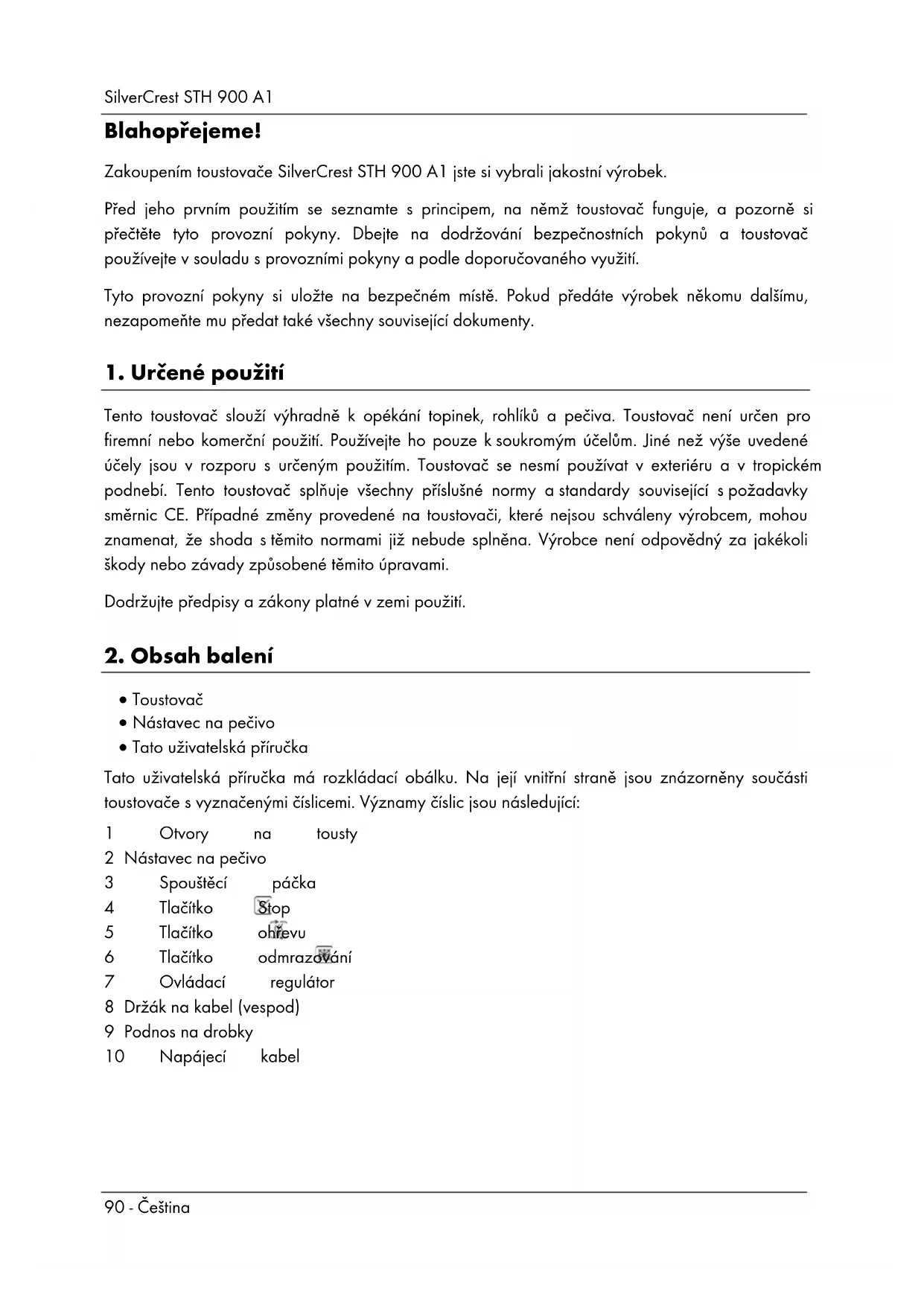 - Tato uživatelská příručka Tato uživatelská příručka má rozkládací obálku. Na její vnitřní straně jsou znázorněny součásti toustovače s vyznačenými číslicemi. Významy číslic jsou následující: 1 Otvory na tousty 2 Nástavec na pečivo 3 Spouštěcí páčka 4 Tlačítko Stop 5 Tlačítko ohřevu 6 Tlačítko odmrazování 7 Ovládací regulátor 8 Držák na kabel (vespod) 9 Podnos na drobky 10 Napájecí kabelSilverCrest STH 900 A1 Čeština - 91