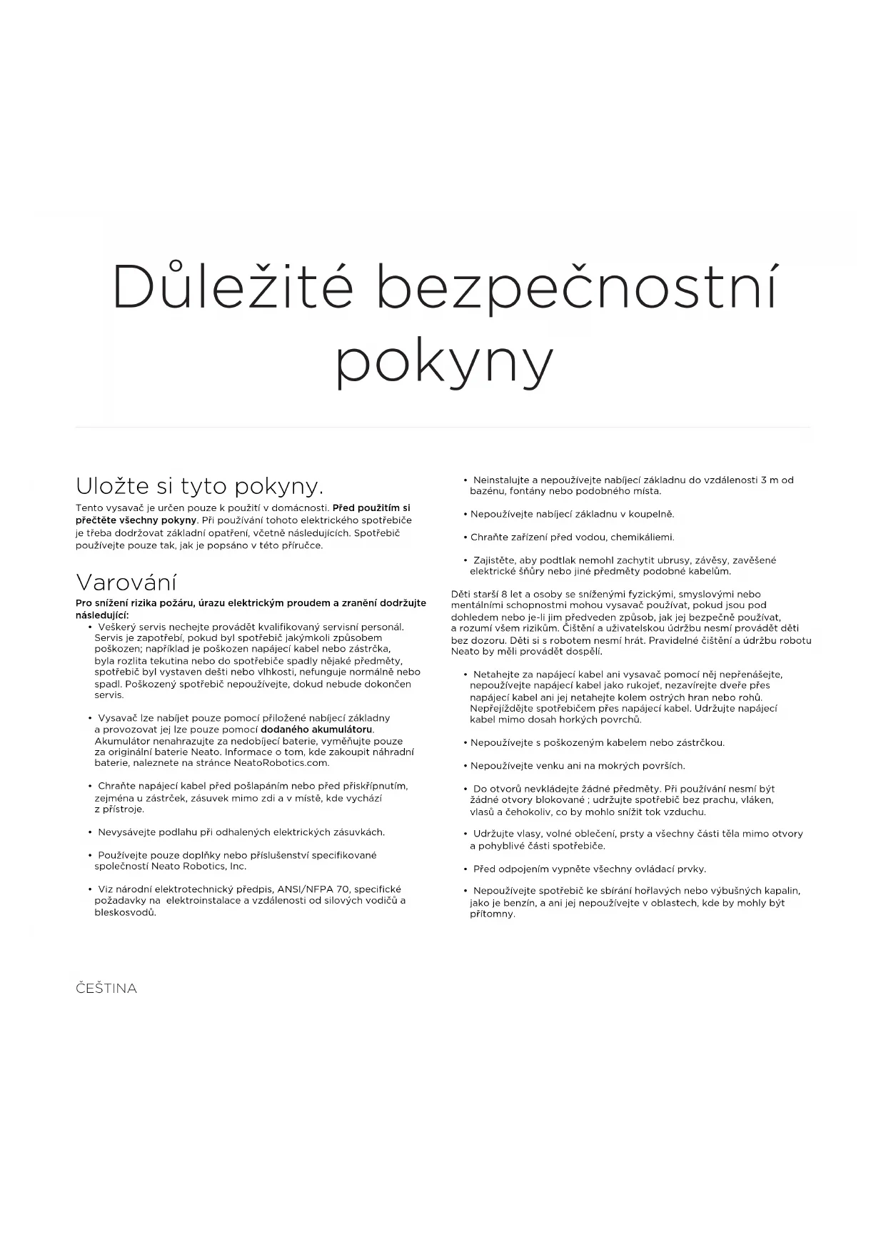 - Zajistěte, aby podtlak nemohl zachytit ubrusy, závěsy, zavěšené elektrické šňůry nebo jiné předměty podobné kabelům. Děti starší 8let a osoby se sníženými fyzickými, smyslovými nebo mentálními schopnostmi mohou vysavač používat, pokud jsou pod dohledem nebo je-li jim předveden způsob, jak jej bezpečně používat, arozumí všem rizikům. Čištění auživatelskou údržbu nesmí provádět děti bez dozoru. Děti si srobotem nesmí hrát. Pravidelné čištění aúdržbu robotu Neato by měli provádět dospělí.