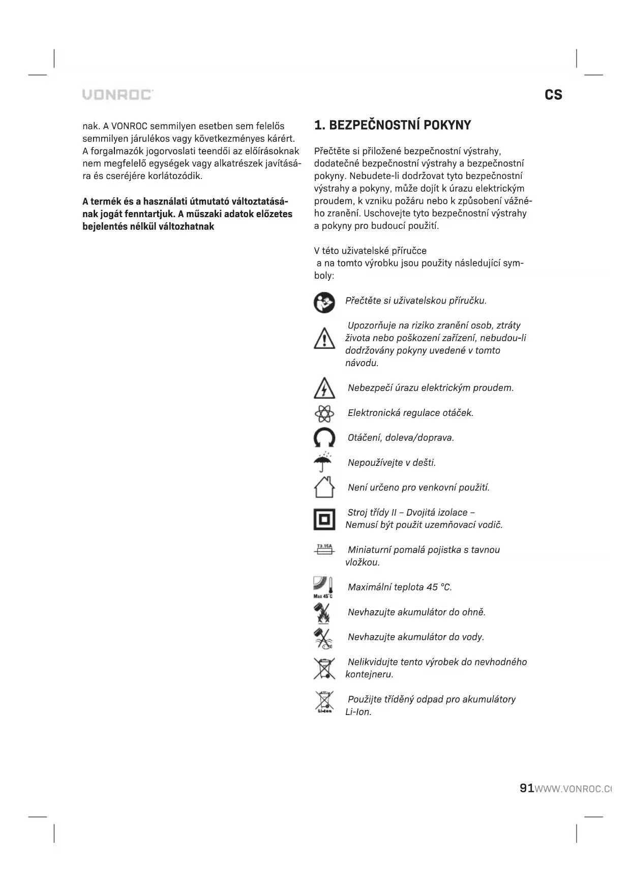 Přečtěte si přiložené bezpečnostní výstrahy, dodatečné bezpečnostní výstrahy abezpečnostní pokyny. Nebudete-li dodržovat tyto bezpečnostní výstrahy apokyny, může dojít kúrazu elektrickým proudem, kvzniku požáru nebo kzpůsobení vážné- ho zranění. Uschovejte tyto bezpečnostní výstrahy apokyny pro budoucí použití. Vtéto uživatelské příručce ana tomto výrobku jsou použity následující sym- boly: Přečtěte si uživatelskou příručku. Upozorňuje na riziko zranění osob, ztráty života nebo poškození zařízení, nebudou-li dodržovány pokyny uvedené vtomto návodu. Nebezpečí úrazu elektrickým proudem. Elektronická regulace otáček. Otáčení, doleva/doprava. Nepoužívejte vdešti. Není určeno pro venkovní použití. Stroj třídy II – Dvojitá izolace – Nemusí být použit uzemňovací vodič. Miniaturní pomalá pojistka stavnou vložkou. Maximální teplota 45 °C. Nevhazujte akumulátor do ohně. Nevhazujte akumulátor do vody. Nelikvidujte tento výrobek do nevhodného kontejneru. Použijte tříděný odpad pro akumulátory Li-Ion.92