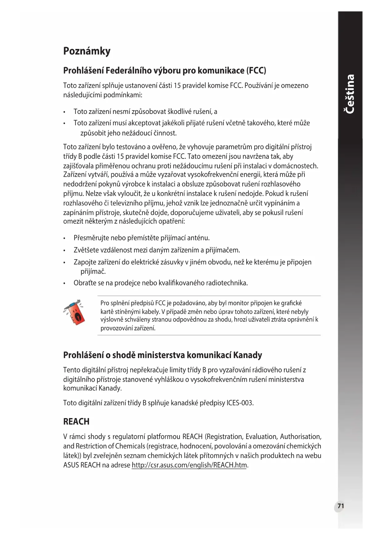- Obraťtesenaprodejcenebokvalikovanéhoradiotechnika. Prohlášení o shodě ministerstva komunikací Kanady Tento digitální přístroj nepřekračuje limity třídy B pro vyzařování rádiového rušení z digitálního přístroje stanovené vyhláškou o vysokofrekvenčním rušení ministerstva komunikací Kanady. Toto digitální zařízení třídy B splňuje kanadské předpisy ICES-003. Pro splnění předpisů FCC je požadováno, aby byl monitor připojen ke gracké kartě stíněnými kabely. V případě změn nebo úprav tohoto zařízení, které nebyly výslovně schváleny stranou odpovědnou za shodu, hrozí uživateli ztráta oprávnění k provozování zařízení. REACH V rámci shody s regulatorní platformou REACH (Registration, Evaluation, Authorisation, and Restriction of Chemicals (registrace, hodnocení, povolování a omezování chemických látek)) byl zveřejněn seznam chemických látek přítomných v našich produktech na webu ASUS REACH na adrese http://csr.asus.com/english/REACH.htm.Čeština