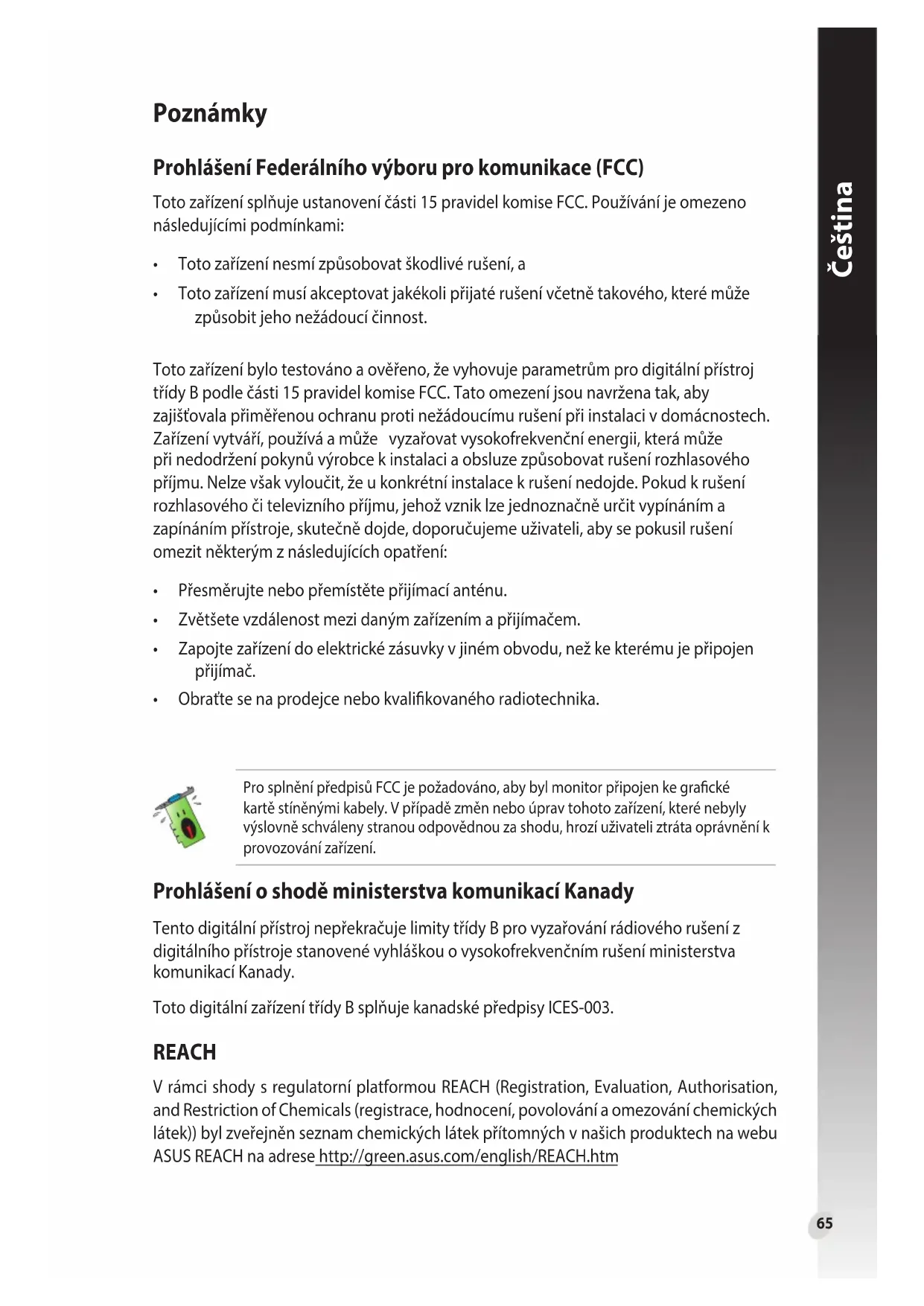 - Obraťtesenaprodejcenebokvalikovanéhoradiotechnika. Prohlášení o shodě ministerstva komunikací Kanady Tento digitální přístroj nepřekračuje limity třídy B pro vyzařování rádiového rušení z digitálního přístroje stanovené vyhláškou o vysokofrekvenčním rušení ministerstva komunikací Kanady. Toto digitální zařízení třídy B splňuje kanadské předpisy ICES-003. Pro splnění předpisů FCC je požadováno, aby byl monitor připojen ke gracké kartě stíněnými kabely. V případě změn nebo úprav tohoto zařízení, které nebyly výslovně schváleny stranou odpovědnou za shodu, hrozí uživateli ztráta oprávnění k provozování zařízení. REACH V rámci shody s regulatorní platformou REACH (Registration, Evaluation, Authorisation, and Restriction of Chemicals (registrace, hodnocení, povolování a omezování chemických látek)) byl zveřejněn seznam chemických látek přítomných v našich produktech na webu ASUS REACH na adrese http://green.asus.com/english/REACH.htmČeština