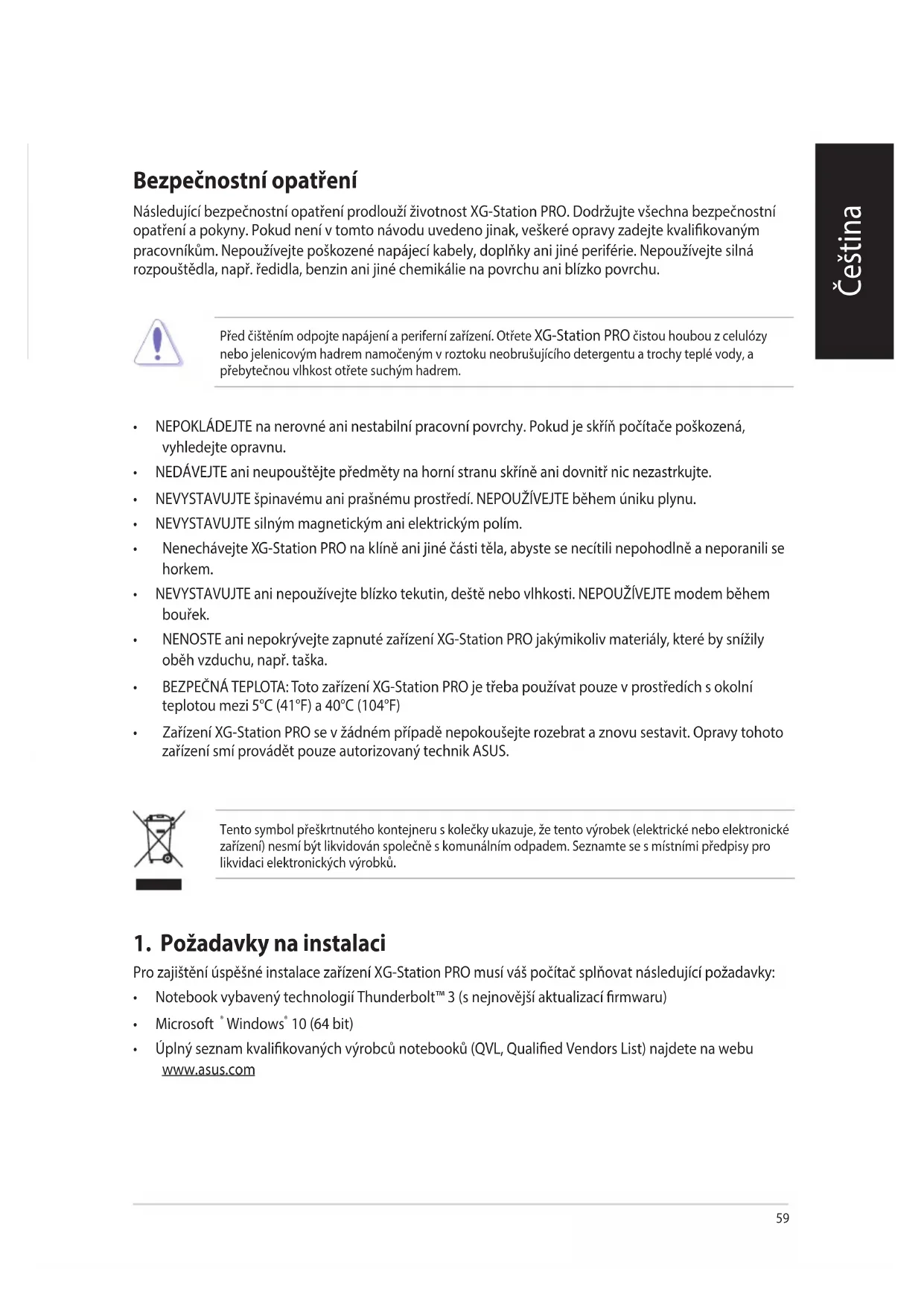 - Zařízení XG-Station PRO se v žádném případě nepokoušejte rozebrat a znovu sestavit. Opravy tohoto zařízení smí provádět pouze autorizovaný technik ASUS. Tento symbol přeškrtnutého kontejneru s kolečky ukazuje, že tento výrobek (elektrické nebo elektronické zařízení) nesmí být likvidován společně s komunálním odpadem. Seznamte se s místními předpisy pro likvidaci elektronických výrobků. Čeština
