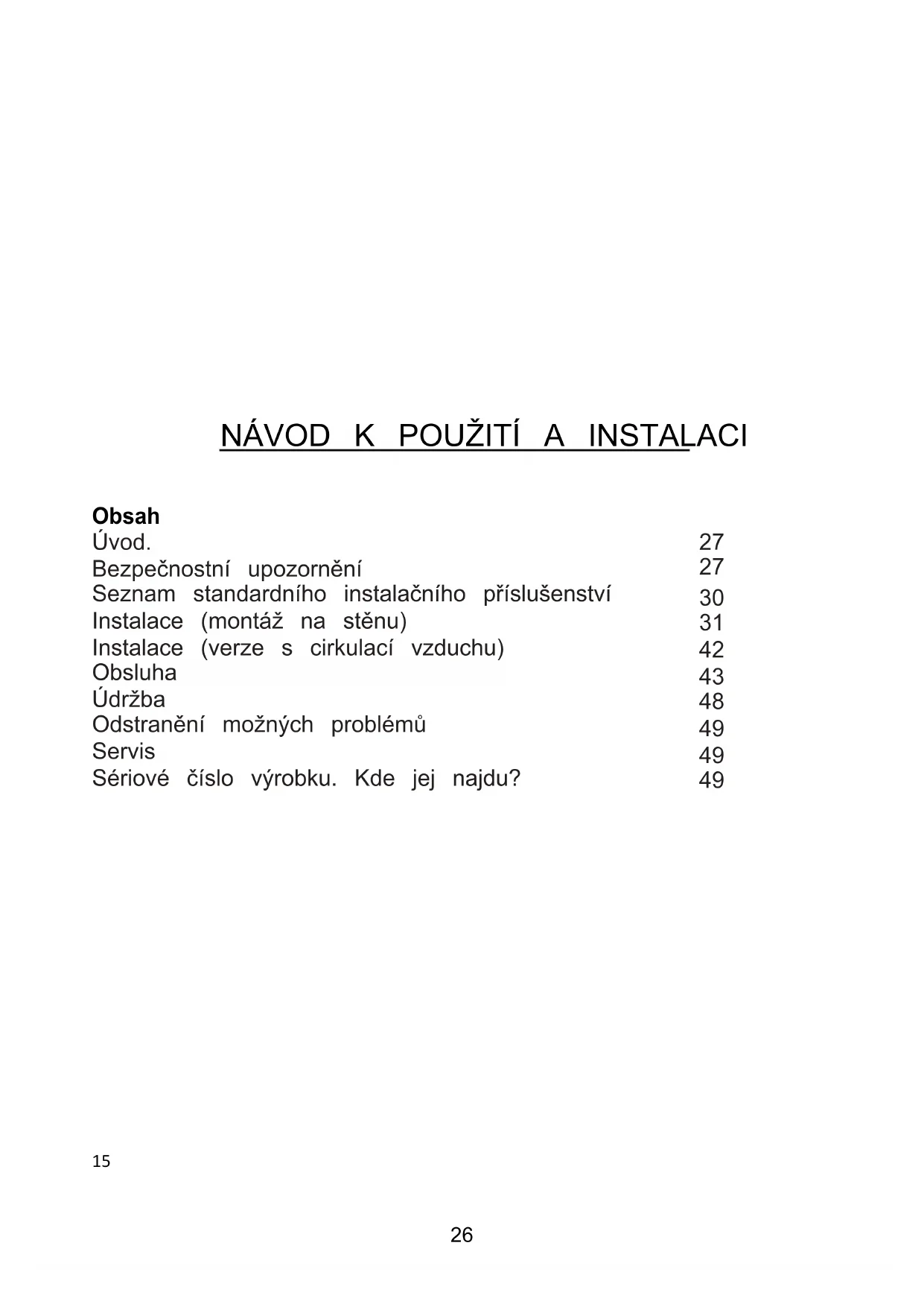 NÁVOD K POUŽITÍ A INSTALACI Obsah Úvod. Bezpečnostní upozornění Seznam standardního instalačního příslušenství Instalace (montáž na stěnu) Instalace (verze s cirkulací vzduchu) Obsluha Údržba Odstranění možných problémů Servis Sériové číslo výrobku. Kde jej najdu?