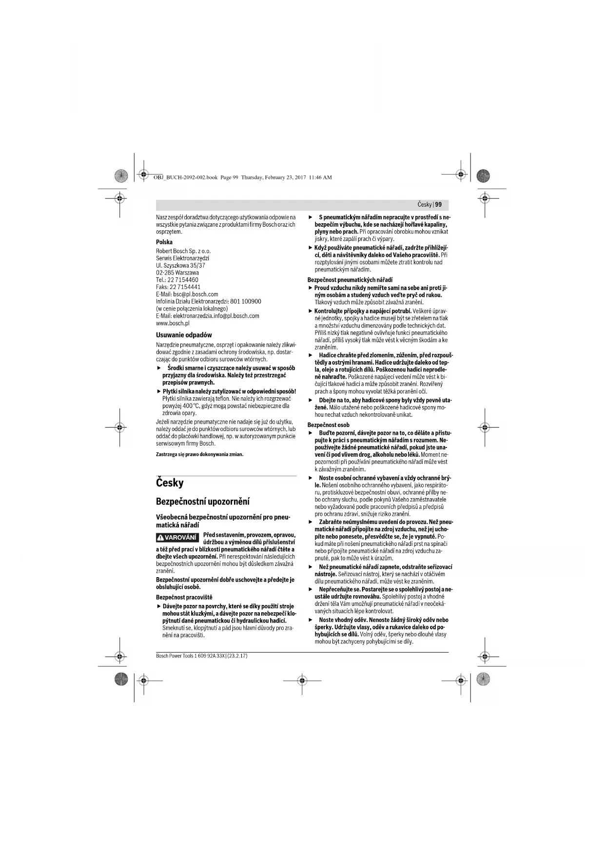 OBJ_BUCH-2092-002.book Page 98 Thursday, February 23, 2017 11:46 AMČesky | 99 Bosch Power Tools 1 609 92A 33X | (23.2.17) Nasz zespół doradztwa dotyczącego użytkowania odpowie na wszystkie pytania związane z produktami firmy Bosch oraz ich osprzętem. Polska Robert Bosch Sp. z o.o. Serwis Elektronarzędzi Ul. Szyszkowa 35/37 02-285 Warszawa Tel.: 22 7154460 Faks: 22 7154441 E-Mail: bsc@pl.bosch.com Infolinia Działu Elektronarzędzi: 801 100900 (w cenie połączenia lokalnego) E-Mail: elektronarzedzia.info@pl.bosch.com www.bosch.pl Usuwanie odpadów Narzędzie pneumatyczne, osprzęt i opakowanie należy zlikwi- dować zgodnie z zasadami ochrony środowiska, np. dostar- czając do punktów odbioru surowców wtórnych. Środki smarne i czyszczące należy usuwać w sposób przyjazny dla środowiska. Należy też przestrzegać przepisów prawnych. Płytki silnika należy zutylizować w odpowiedni sposób! Płytki silnika zawierają teflon. Nie należy ich rozgrzewać powyżej 400 °C, gdyż mogą powstać niebezpieczne dla zdrowia opary. Jeżeli narzędzie pneumatyczne nie nadaje się już do użytku, należy oddać je do punktów odbioru surowców wtórnych, lub oddać do placówki handlowej, np. w autoryzowanym punkcie serwisowym firmy Bosch. Zastrzega się prawo dokonywania zmian. Česky Bezpečnostní upozornění Všeobecná bezpečnostní upozornění pro pneu- matická nářadí Před sestavením, provozem, opravou, údržbou a výměnou dílů příslušenství a též před prací v blízkosti pneumatického nářadí čtěte a dbejte všech upozornění. Při nerespektování následujících bezpečnostních upozornění mohou být důsledkem závažná zranění. Bezpečnostní upozornění dobře uschovejte a předejte je obsluhující osobě. Bezpečnost pracoviště Dávejte pozor na povrchy, které se díky použití stroje mohou stát kluzkými, a dávejte pozor na nebezpečí klo- pýtnutí dané pneumatickou či hydraulickou hadicí. Smeknutí se, klopýtnutí a pád jsou hlavní důvody pro zra- nění na pracovišti. S pneumatickým nářadím nepracujte v prostředí s ne- bezpečím výbuchu, kde se nacházejí hořlavé kapaliny, plyny nebo prach. Při opracování obrobku mohou vznikat jiskry, které zapálí prach či výpary. Když používáte pneumatické nářadí, zadržte přihlížejí- cí, děti a návštěvníky daleko od Vašeho pracoviště. Při rozptylování jinými osobami můžete ztratit kontrolu nad pneumatickým nářadím. Bezpečnost pneumatických nářadí Proud vzduchu nikdy nemiřte sami na sebe ani proti ji- ným osobám a studený vzduch veďte pryč od rukou. Tlakový vzduch může způsobit závažná zranění. Kontrolujte přípojky a napájecí potrubí. Veškeré úprav- né jednotky, spojky a hadice musejí být se zřetelem na tlak a množství vzduchu dimenzovány podle technických dat. Příliš nízký tlak negativně ovlivňuje funkci pneumatického nářadí, příliš vysoký tlak může vést k věcným škodám a ke zraněním. Hadice chraňte před zlomením, zúžením, před rozpouš- tědly a ostrými hranami. Hadice udržujte daleko od tep- la, oleje a rotujících dílů. Poškozenou hadici neprodle- ně nahraďte. Poškozené napájecí vedení může vést k bi- čující tlakové hadici a může způsobit zranění. Rozvířený prach a špony mohou vyvolat těžká poranění očí. Dbejte na to, aby hadicové spony byly vždy pevně uta- žené. Málo utažené nebo poškozené hadicové spony mo- hou nechat vzduch nekontrolovaně unikat. Bezpečnost osob Buďte pozorní, dávejte pozor na to, co děláte a přistu- pujte k práci s pneumatickým nářadím s rozumem. Ne- používejte žádné pneumatické nářadí, pokud jste una- vení či pod vlivem drog, alkoholu nebo léků. Moment ne- pozornosti při používání pneumatického nářadí může vést k závažným zraněním. Noste osobní ochranné vybavení a vždy ochranné brý- le. Nošení osobního ochranného vybavení, jako respiráto- ru, protiskluzové bezpečnostní obuvi, ochranné přilby ne- bo ochrany sluchu, podle pokynů Vašeho zaměstnavatele nebo vyžadované podle pracovních předpisů a předpisů pro ochranu zdraví, snižuje riziko zranění. Zabraňte neúmyslnému uvedení do provozu. Než pneu- matické nářadí připojíte na zdroj vzduchu, než jej ucho- píte nebo ponesete, přesvědčte se, že je vypnuté. Po- kud máte při nošení pneumatického nářadí prst na spínači nebo připojíte pneumatické nářadí na zdroj vzduchu za- pnuté, pak to může vést k úrazům. Než pneumatické nářadí zapnete, odstraňte seřizovací nástroje. Seřizovací nástroj, který se nachází v otáčivém dílu pneumatického nářadí, může vést ke zraněním. Nepřeceňujte se. Postarejte se o spolehlivý postoj a ne- ustále udržujte rovnováhu. Spolehlivý postoj a vhodné držení těla Vám umožňují pneumatické nářadí v neočeká- vaných situacích lépe kontrolovat. Noste vhodný oděv. Nenoste žádný široký oděv nebo šperky. Udržujte vlasy, oděv a rukavice daleko od po- hybujících se dílů. Volný oděv, šperky nebo dlouhé vlasy mohou být zachyceny pohybujícími se díly. VAROVÁNÍ OBJ_BUCH-2092-002.book Page 99 Thursday, February 23, 2017 11:46 AM100 | Česky 1 609 92A 33X | (23.2.17) Bosch Power Tools Pokud lze namontovat přípravky pro odsávání či zachy- távání prachu, přesvědčte se, že jsou připojené a že bu- dou správně použité. Používání těchto přípravků snižuje ohrožení prachem. Výstupní vzduch přímo nevdechujte. Zabraňte tomu, aby se výstupní vzduch dostal do očí. Výstupní vzduch pneumatického nářadí může obsahovat vodu, olej, kovové částice a nečistoty z kompresoru. To může způsobit újmy na zdraví. Pečlivé zacházení a používání pneumatického nářadí Pro pevné podržení a podepření obrobku používejte 