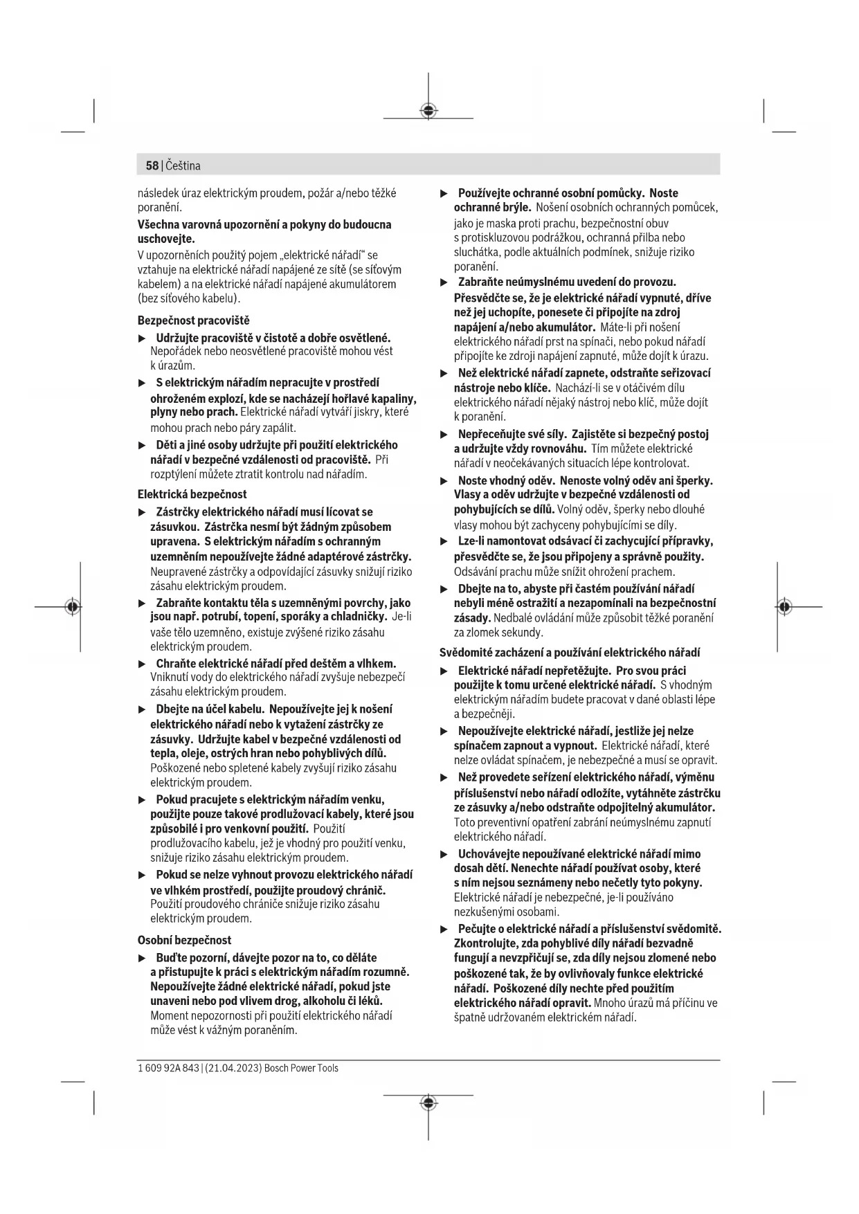 u Chraňte elektrické nářadí před deštěm avlhkem. Vniknutí vody do elektrického nářadí zvyšuje nebezpečí zásahu elektrickým proudem. u Pokud se nelze vyhnout provozu elektrického nářadí ve vlhkém prostředí, použijte proudový chránič. Použití proudového chrániče snižuje riziko zásahu elektrickým proudem. u Nepoužívejte elektronářadí spoškozeným kabelem. Pokud se kabel během práce poškodí, nedotýkejte se ho avytáhněte síťovou zástrčku ze zásuvky. Poškozené kabely zvyšují riziko zásahu elektrickým proudem. u Nepřejíždějte ani neuskřípněte kabel. Netahejte za kabel při odpojování zástrčky ze zásuvky ani při přemisťování elektrického nářadí. Poškozené kabely zvyšují riziko úrazu elektrickým proudem. u Než budete provádět nastavení nářadí, vyměňovat příslušenství nebo elektronářadí odložíte, vytáhněte zástrčku ze zásuvky. Toto preventivní opatření zabrání neúmyslnému zapnutí elektronářadí. Popis výrobku avýkonu Přečtěte si všechna bezpečnostní upozornění avšechny pokyny. Nedodržování bezpečnostních upozornění apokynů může mít za následek úraz elektrickým proudem, požár a/nebo těžká poranění. Řiďte se obrázky vpřední části návodu kobsluze. Použití vsouladu surčeným účelem Elektrické nářadí je vhodné pro vysávání asfoukávání zdravotně nezávadných látek. Elektrické nářadí není vhodné pro vysávání asfoukávání hořlavých materiálů, kovových třísek aostrých předmětů, jako šroubů nebo hřebíků. Zobrazené součásti Číslování zobrazených součástí se vztahuje kvyobrazení elektrického nářadí na straně sobrázky. (1) Rukojeť (2) Vypínač (3) Aretační tlačítko vypínače (4) Kolečko pro regulaci množství vzduchu (5) Výstup vzduchu (6) Krytky uhlíků (7) Tryska (8) Vak na prach (9) Přívod vzduchu (10) Uhlíky Technické údaje Ofukovací pistole GBL 800 E Číslo zboží 3601J804.. Jmenovitý příkon W 820 Objem vzduchu m³/min 4,5 Tlak vzduchu mbar 0–72 Hmotnost podle EPTA- Procedure01:2014 kg 1,8 Třída ochrany /II Údaje platí pro jmenovité napětí [U] 230V. Uodlišných napětí auspecifických provedení pro příslušné země se mohou tyto údaje lišit. Hodnoty se mohou podle výrobku lišit amají na ně vliv podmínky použití aprostředí. Další informace najdete na www.bosch-professional.com/wac. Informace ohluku avibracích Hodnoty hlučnosti zjištěné podle EN62841‑1. Bosch Power Tools 1 609 92A 843 | (21.04.2023)60 | Čeština Hladina hluku elektrického nářadí stanovená za použití váhového filtruA činí typicky: hladina akustického tlaku 89dB(A); hladina akustického výkonu 100dB(A). Nejistota K=3dB. Noste chrániče sluchu! Celkové hodnoty vibrací a