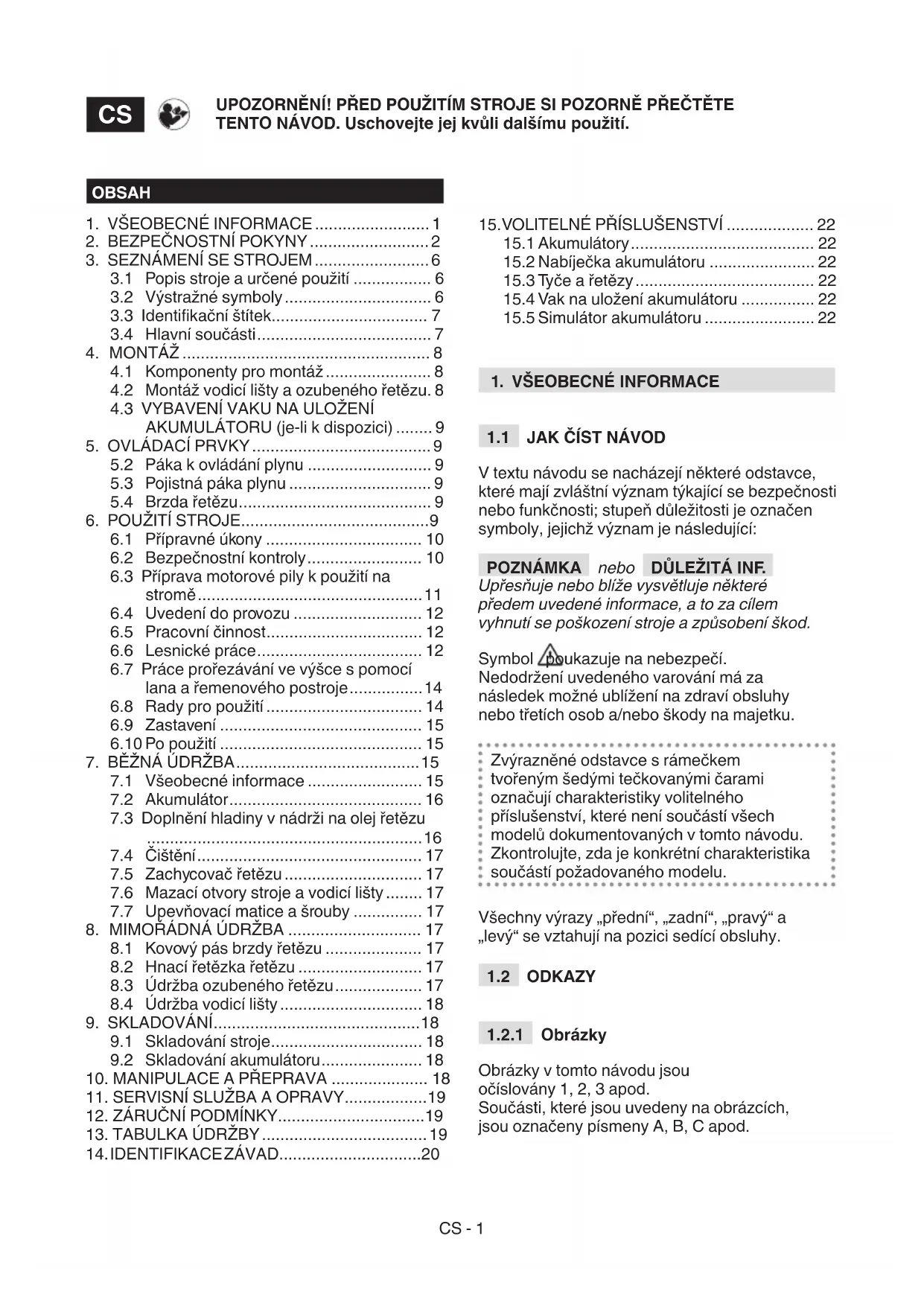 naproti montážnímu bodu vodicí lišty, které při styku se stromem nebo kmenem slouží jako opora. J. Ochranný kryt zubové opěrky: ochranný kryt zubové opěrky, který se používá během manipulace, přepravy nebo skladování stroje. Před zahájením pracovní činnosti je třeba tento kryt sejmout. K. Ochranný kryt vodicí lišty: ochranný kryt řetězové pily na vodicí liště,CS - 8 který se používá během manipulace, přepravy nebo skladování stroje. L. Akumulátor (není-li dodán spolu se strojem, viz. odst. 15.1. „volitelné příslušenství“): zařízení, které dodává elektrický proud do nástroje; jeho parametry a pokyny k použití jsou popsány ve specickém návodu. M. Nabíječka akumulátoru (pokud není dodaná se strojem, viz odst. 15.2 „volitelné příslušenství“): zařízení, které se používá k nabíječka akumulátoru. K dispozici jsou dva modely nabíječky akumulátoru: M1 (rychlé nabíjení akumulátoru); M2 (standardní nabíjení akumulátoru). N. Vak na uložení akumulátoru (příslušenství dostupné na vyžádání, odst. 15.4): zařízení, které umožní uložit akumulátor. O. Připojovací kabel: kabel, který umožní připojit stroj k vaku na uložení akumulátoru. P. Simulátor akumulátoru (příslušenství dostupné na vyžádání, odst. 15.5): Zařízení, které, pokud je zapojené ke krytu stroje, umožní použití vaku na uložení akumulátoru.