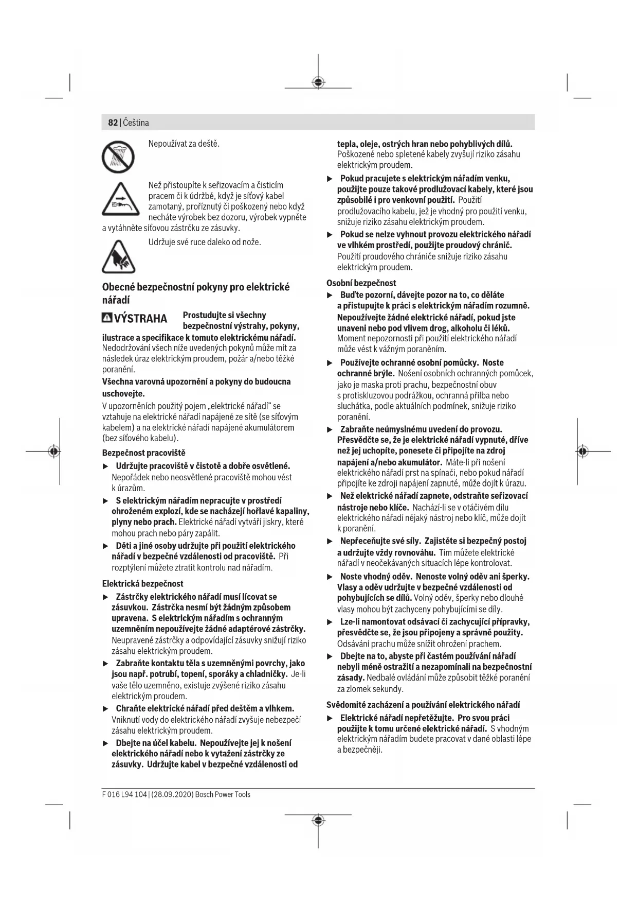 EU prohlášení oshodě Prohlašujeme na výhradní zodpovědnost, že uvedený výrobek splňuje všechna příslušná ustanovení níže uvedených směrnic anařízení aje vsouladu snásledujícími normami:* Nůžky na živý plot Objednací číslo Bosch Power Tools F 016 L94 104 | (28.09.2020)II