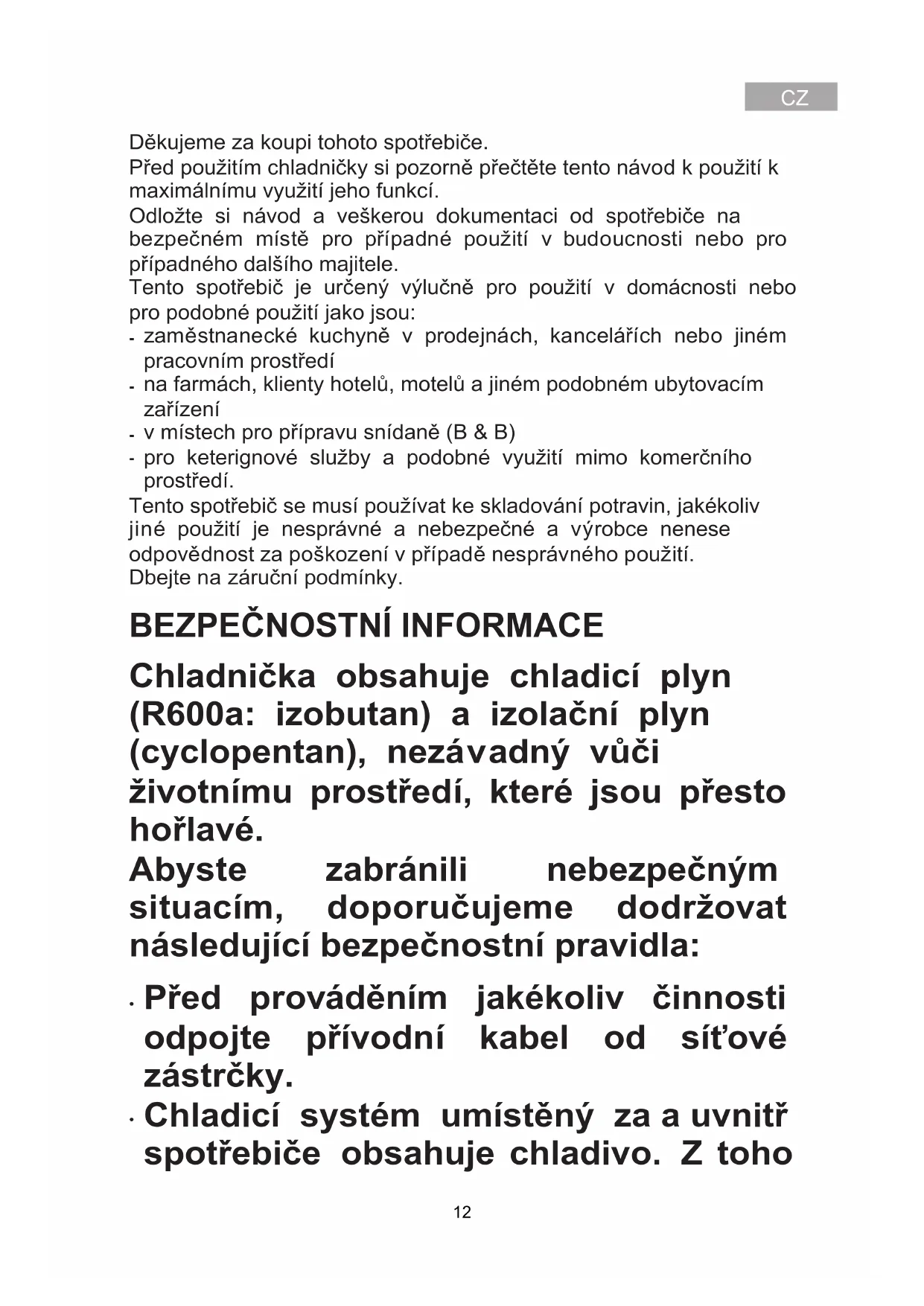 Eliminare la polvere presente sul retro dell’apparecchio (vedi PULIZIA). 9Attendere almeno due ore prima di accendere l'apparecchio, per assicurarsi che il circuito refrigerante sia completamente efficiente. 1011Děkujeme za koupi tohoto spotřebiče. Před použitím chladničky si pozorně přečtěte tento návod k použití k maximálnímu využití jeho funkcí. Odložte si návod a veškerou dokumentaci od spotřebiče na bezpečném místě pro případné použití v budoucnosti nebo pro případného dalšího majitele. Tento spotřebič je určený výlučně pro použití v domácnosti nebo pro podobné použití jako jsou: